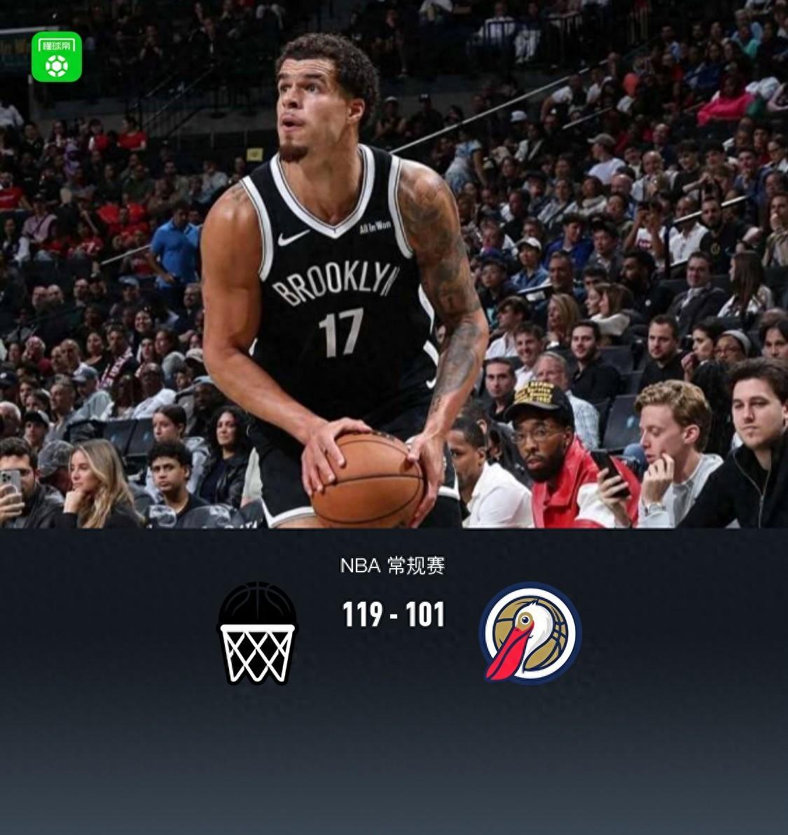 北京時間12月7日NBA 常規賽,布魯克林籃網對陣新奧爾良鵜鶘。上半場籃網波特22分帶隊建立近20分領先,半場籃網62-44鵜鶘,下半場鵜鶘無力反撲,最終籃網119-101鵜鶘。