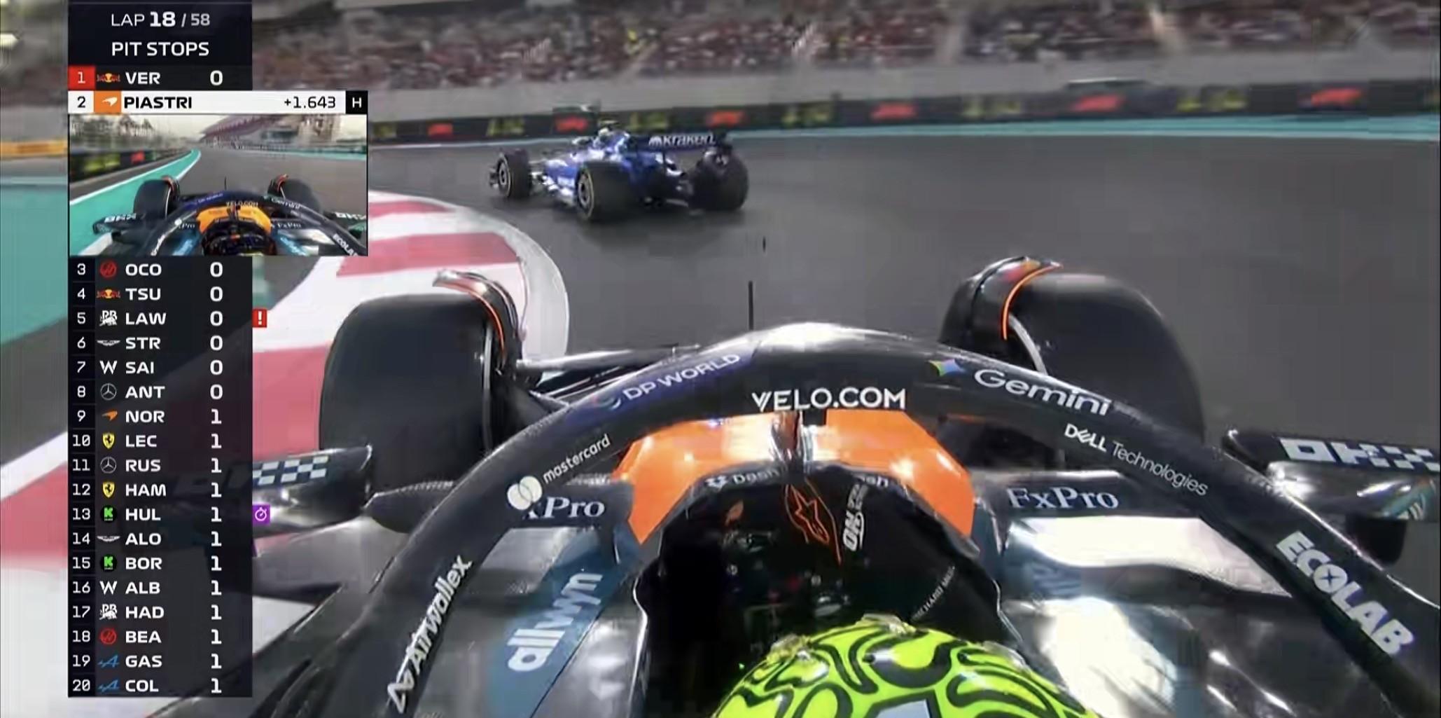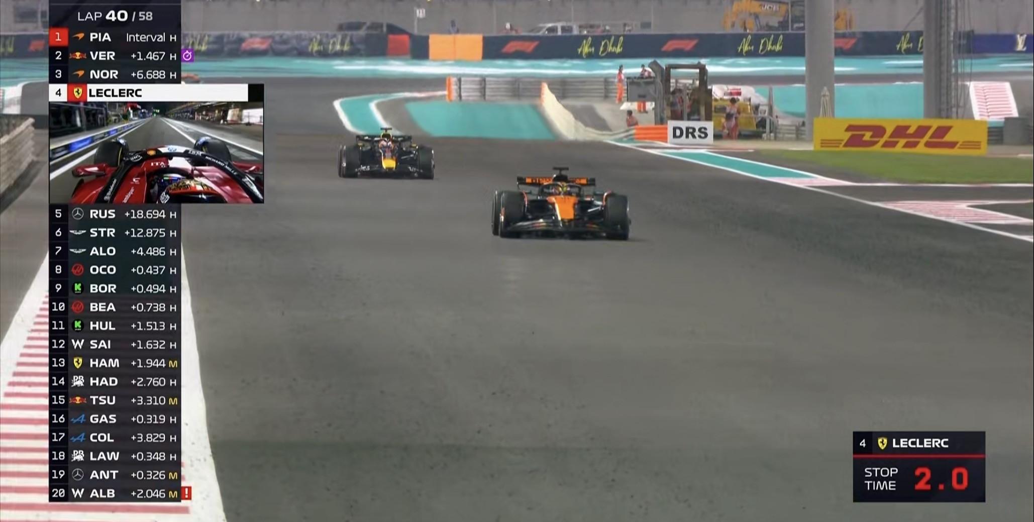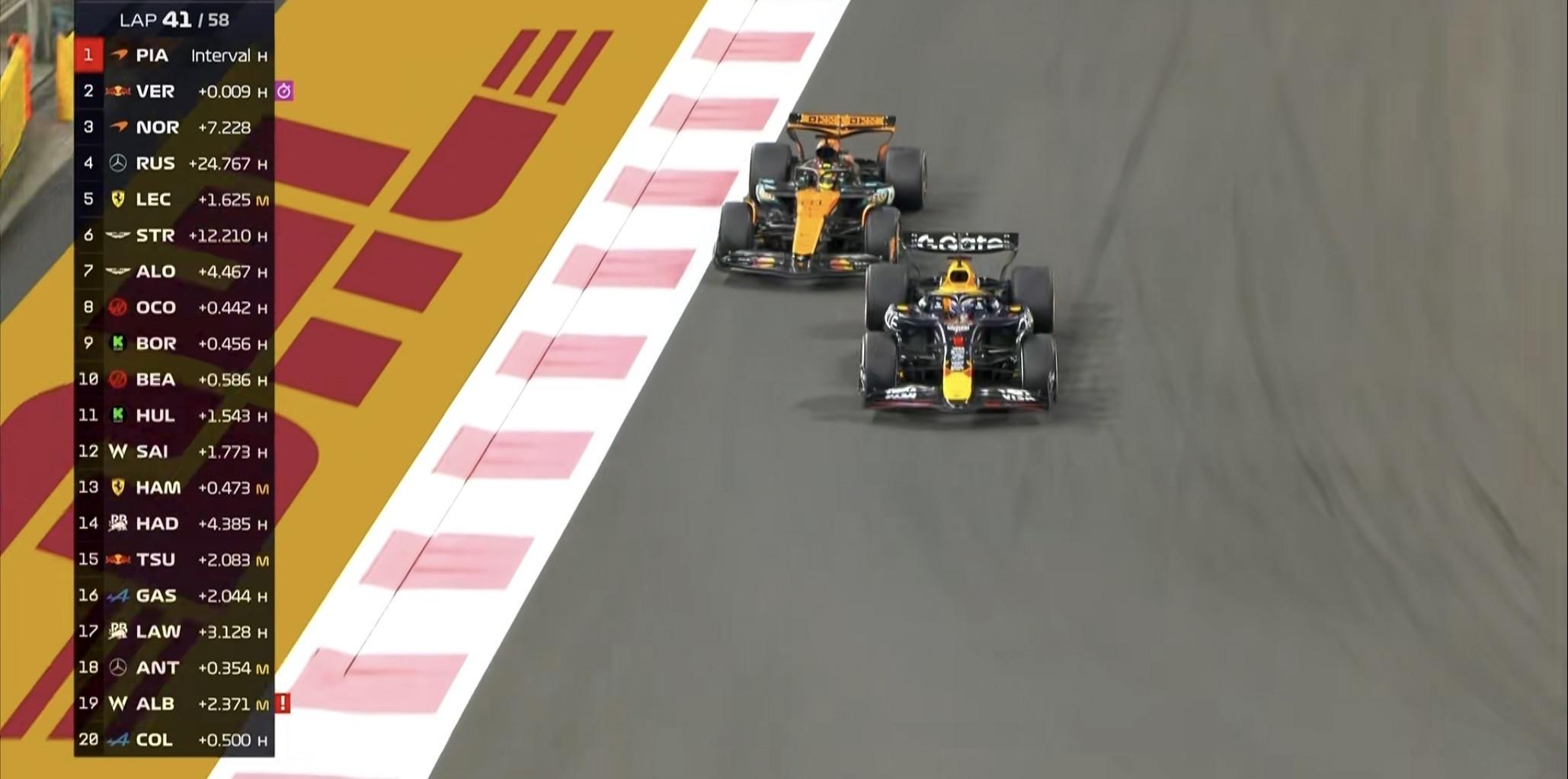 第41圈:諾里斯回應勒克萊爾完成二停,維斯塔潘來到皮亞斯特里身後;