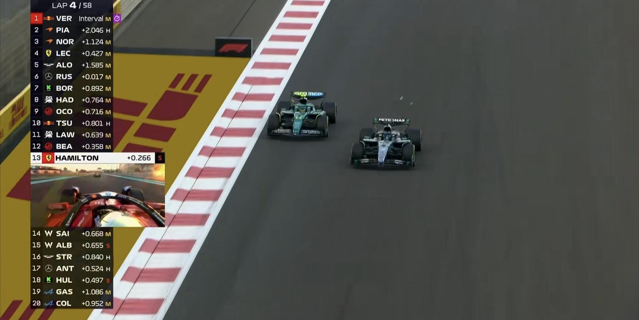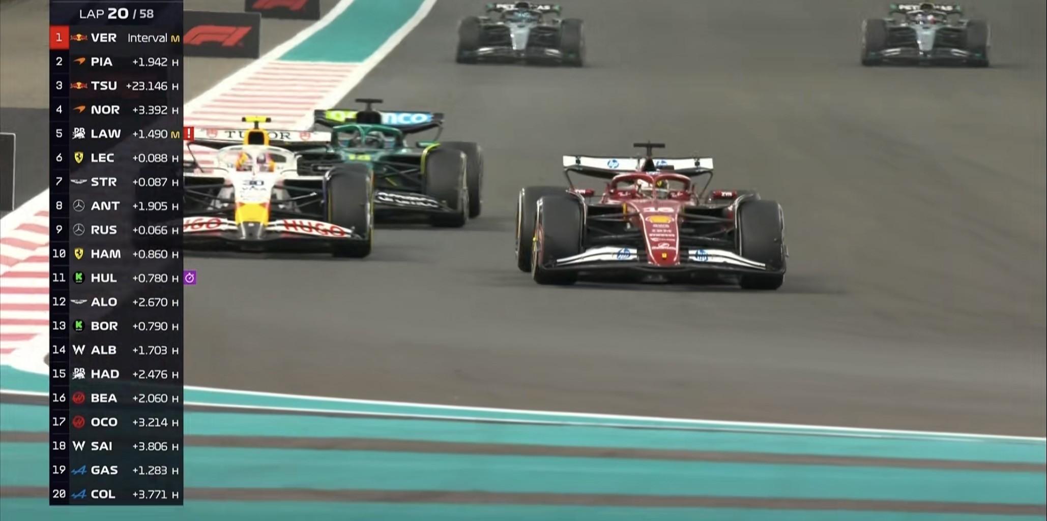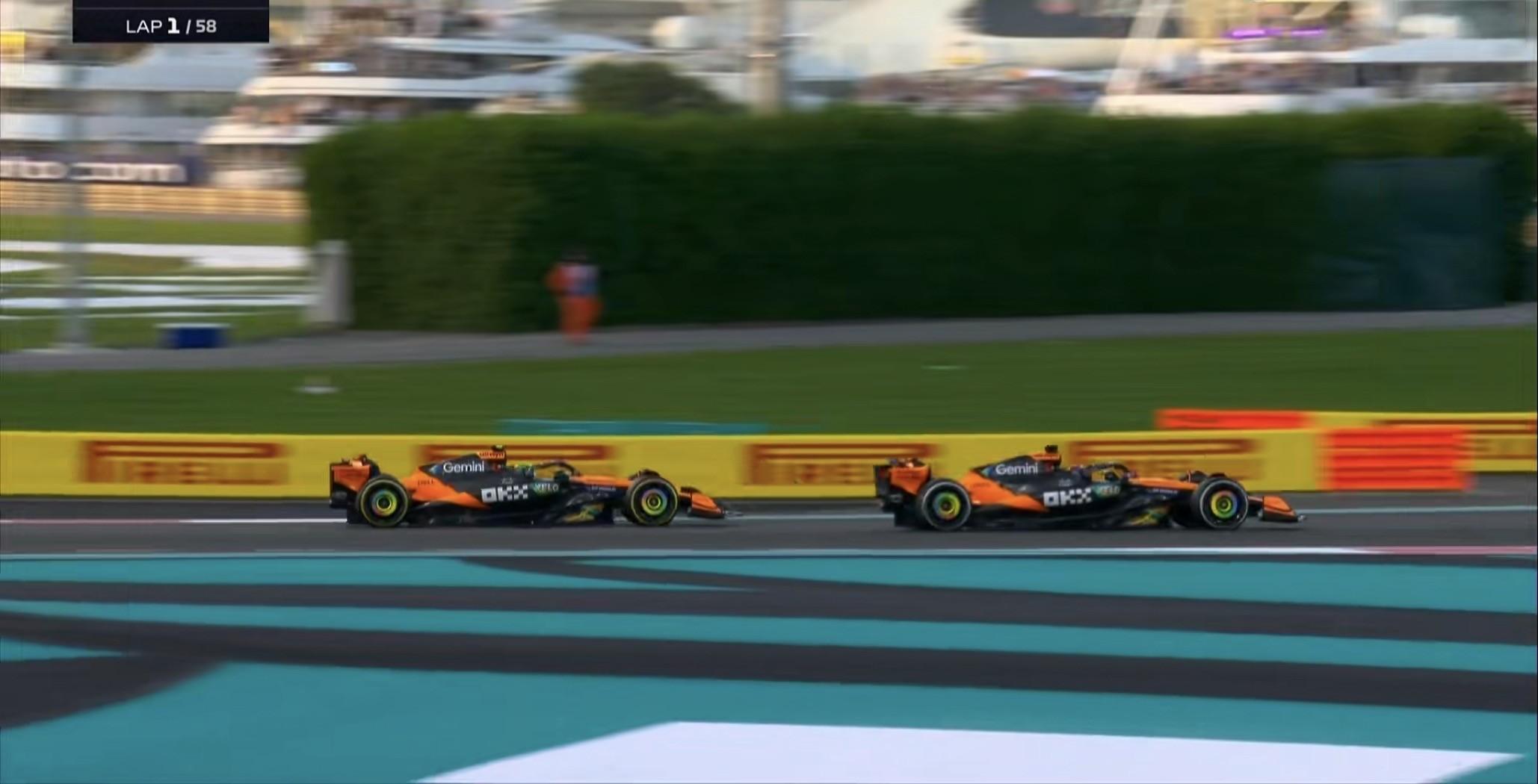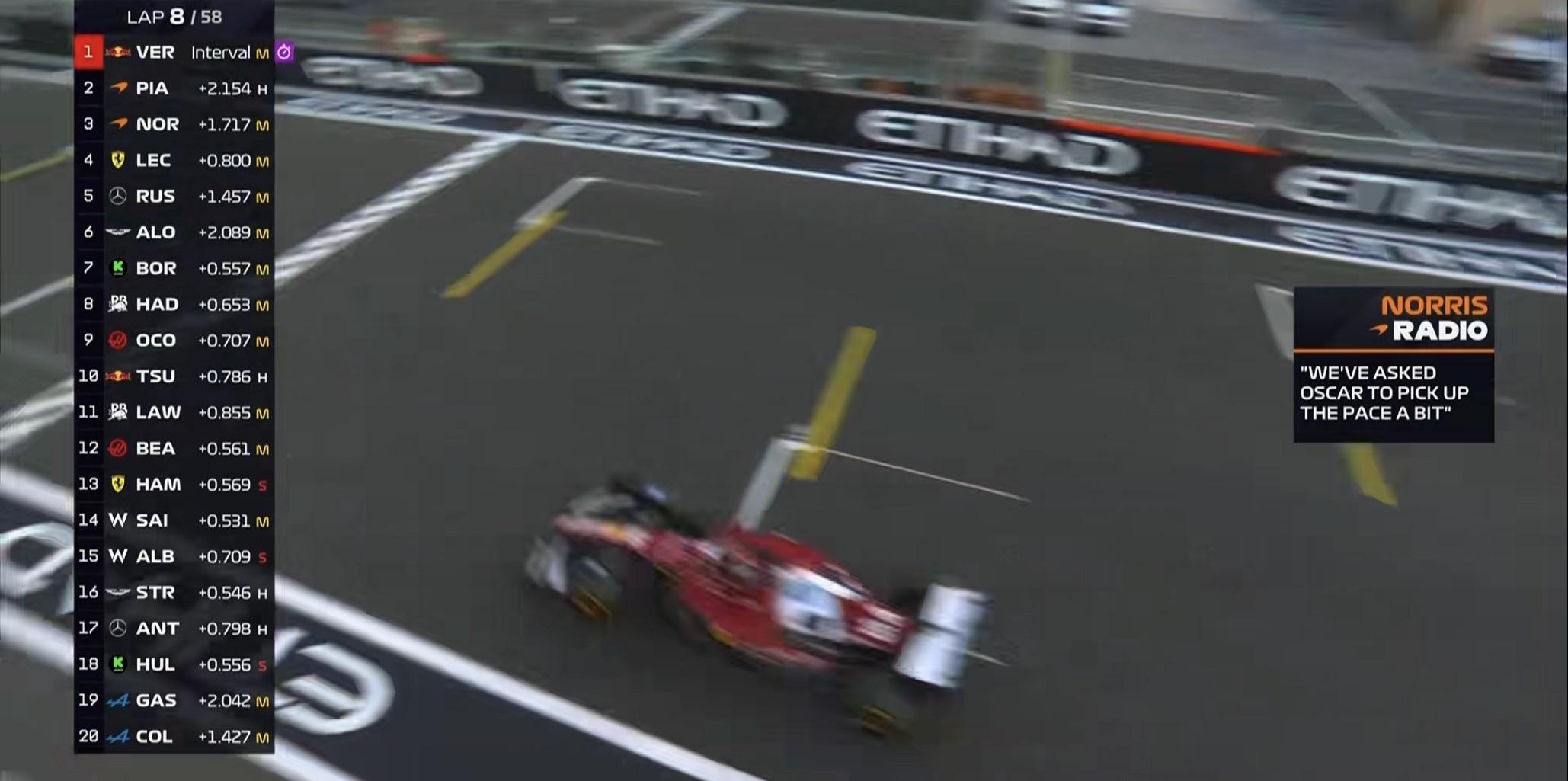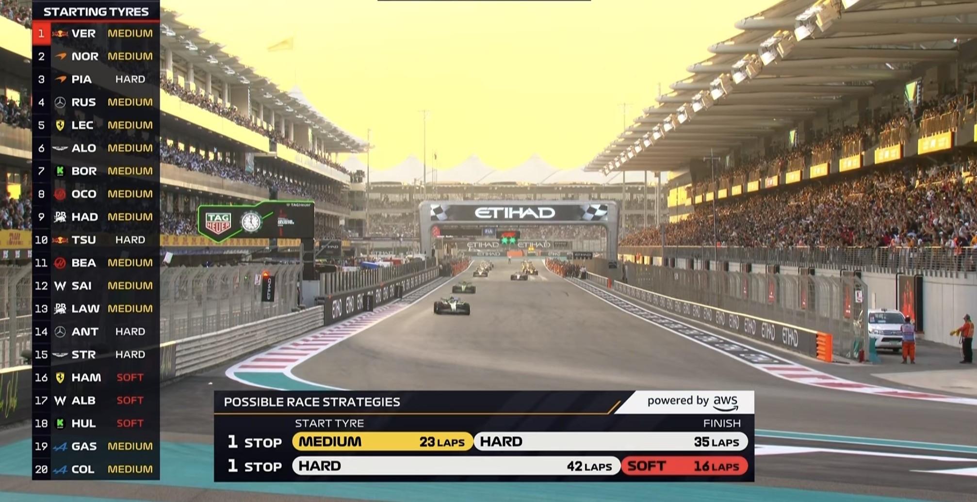 起步輪胎方面:維斯塔潘、諾里斯中性胎起步,皮亞斯特里硬胎起步,後方漢密爾頓、阿爾本、霍肯博格使用軟胎;