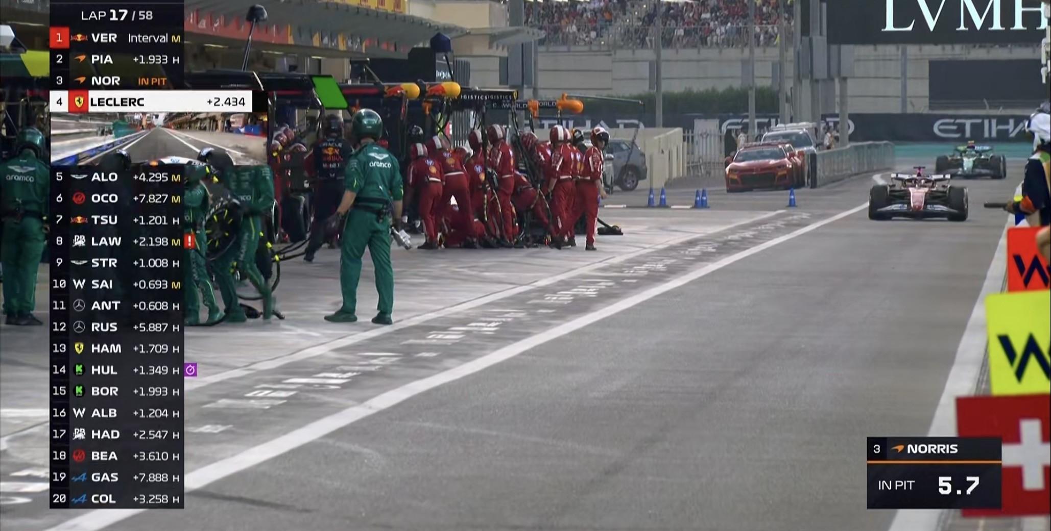 第17圈:諾里斯、勒克萊爾進站執行一停,出站後卡在拉塞爾之前,避免被undercut;