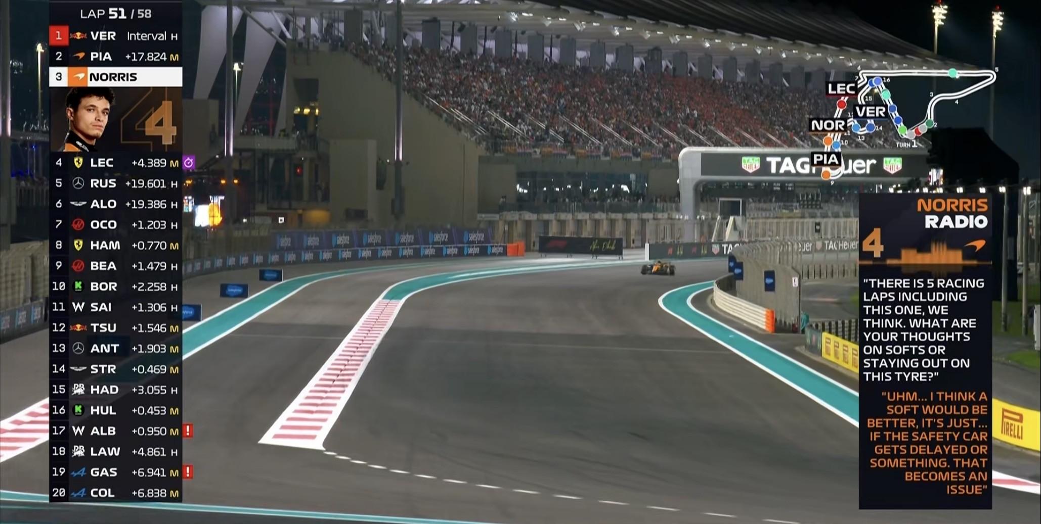 第51圈:工程師告知諾里斯目前一切順利,如果有安全車的話諾里斯傾向換軟胎,但他擔心相對勒克萊爾丟失位置;