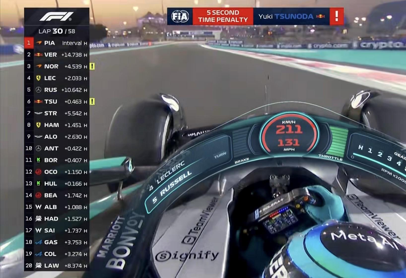 第30圈:角田因二次變線擠壓諾里斯被罰5秒,諾里斯未遭到處罰!