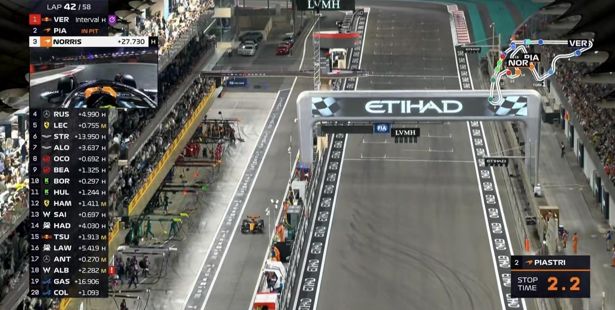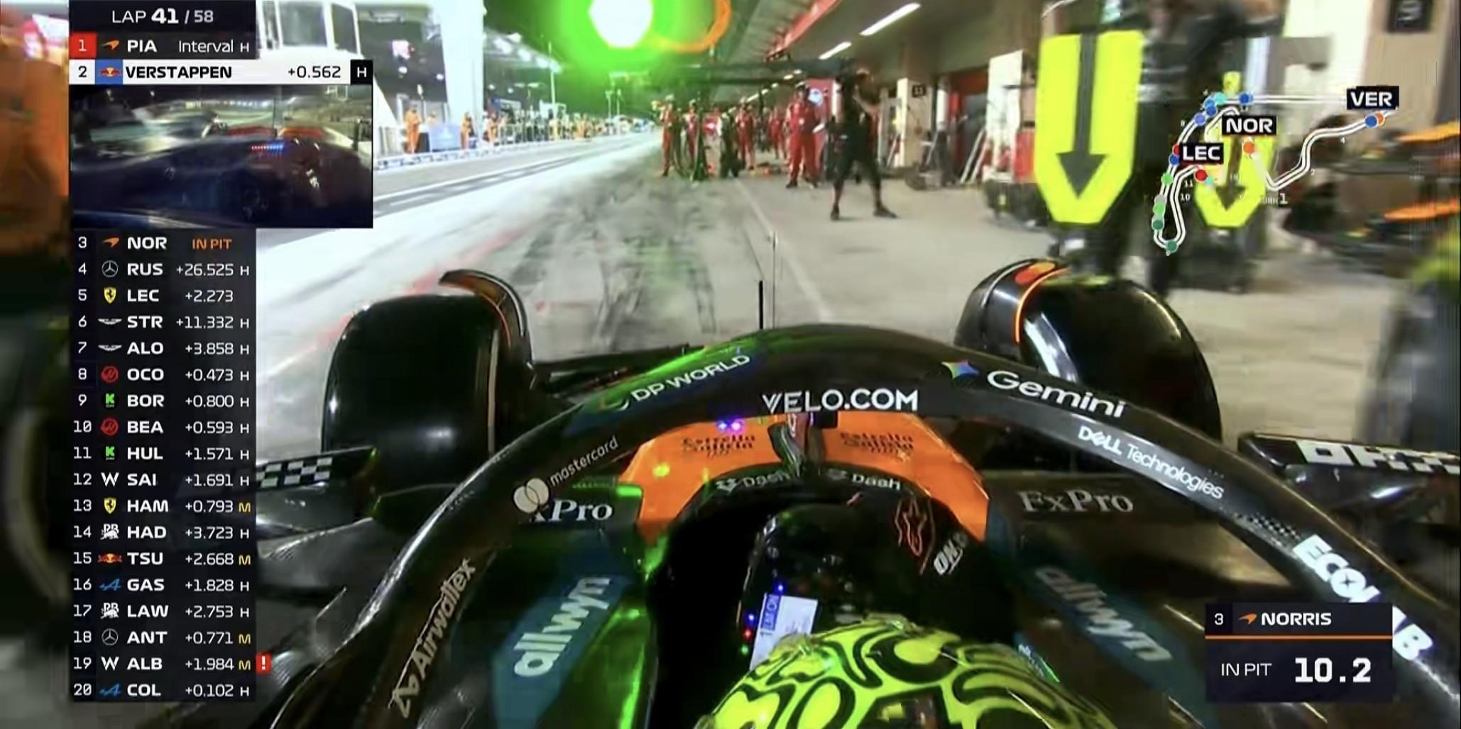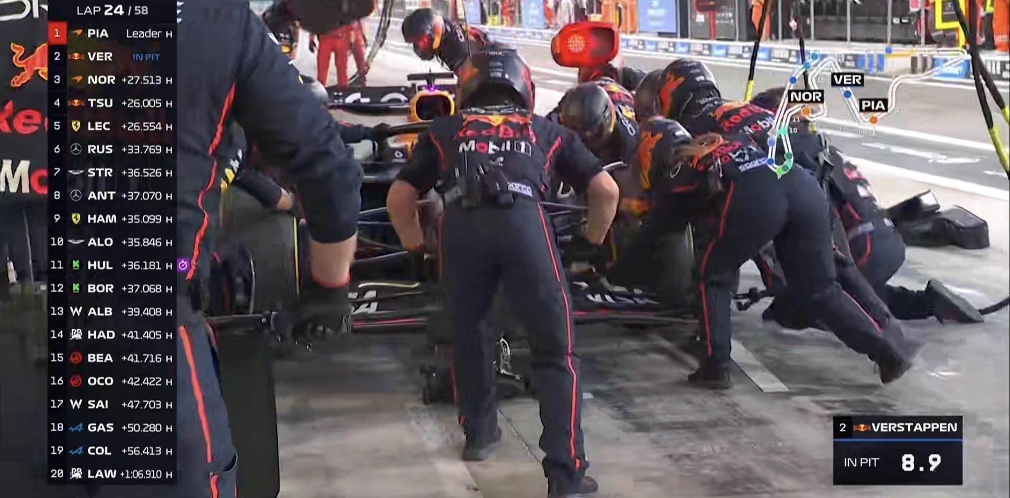 第24圈:維斯塔潘隨即進站完成一停,出站後卡在諾里斯身前;