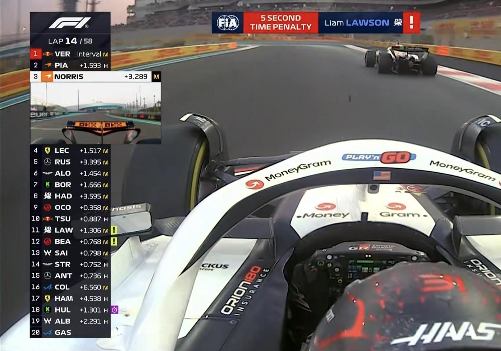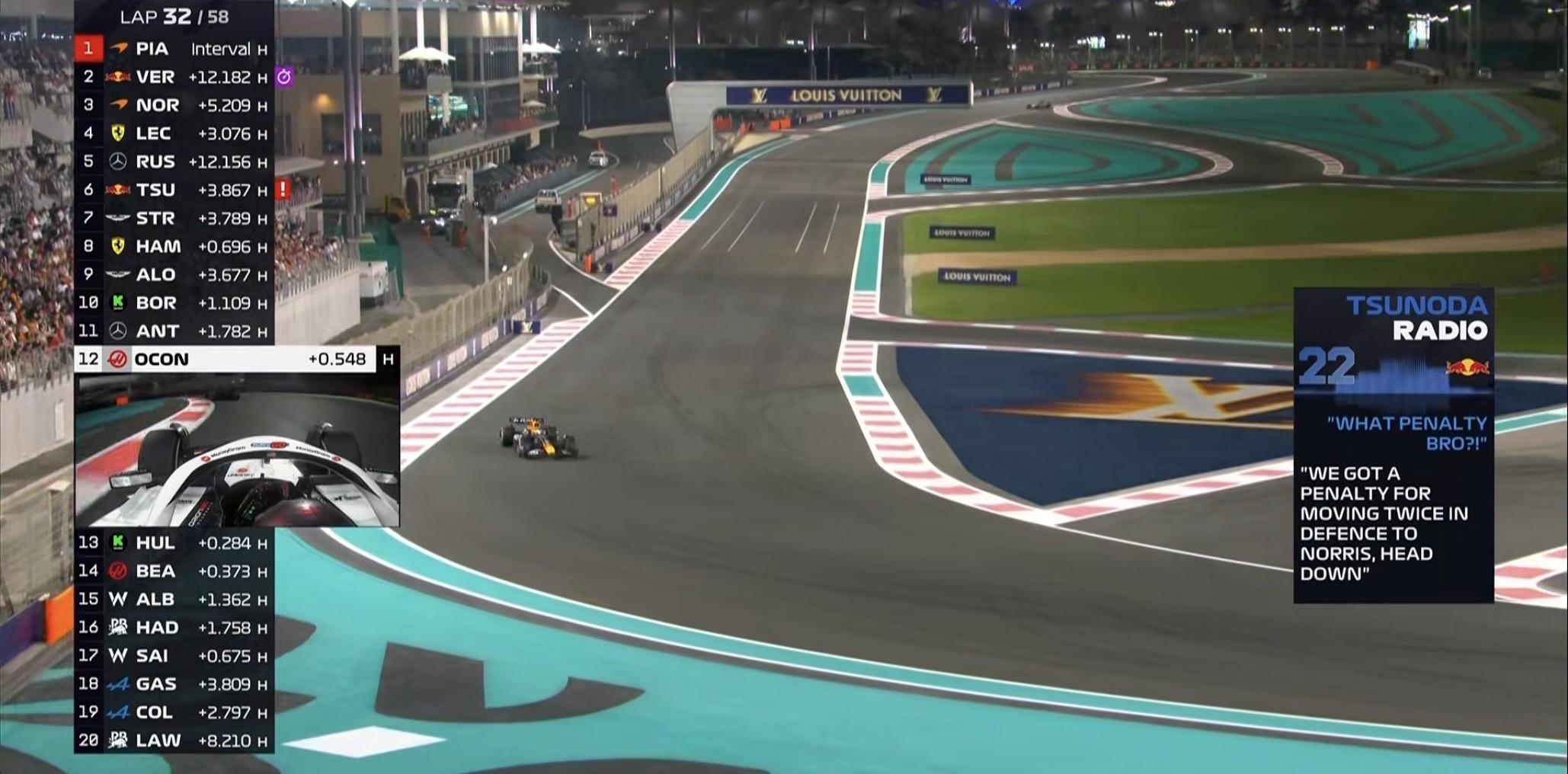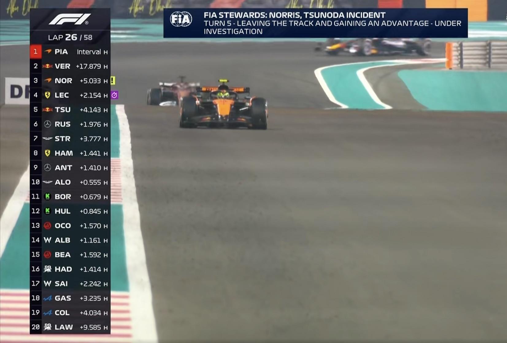 第26圈:諾里斯因賽道外超越獲利遭到調查,同時角田因將諾里斯擠出賽道也遭到調查;