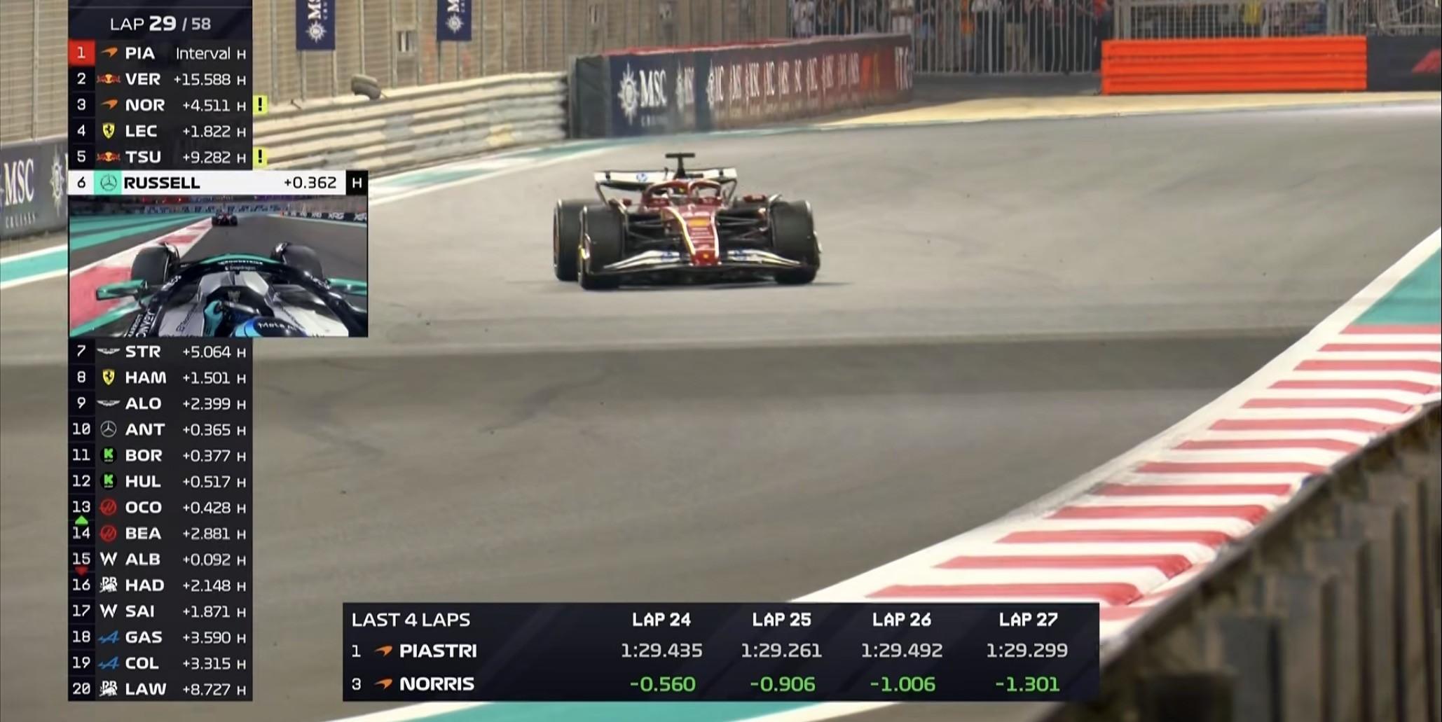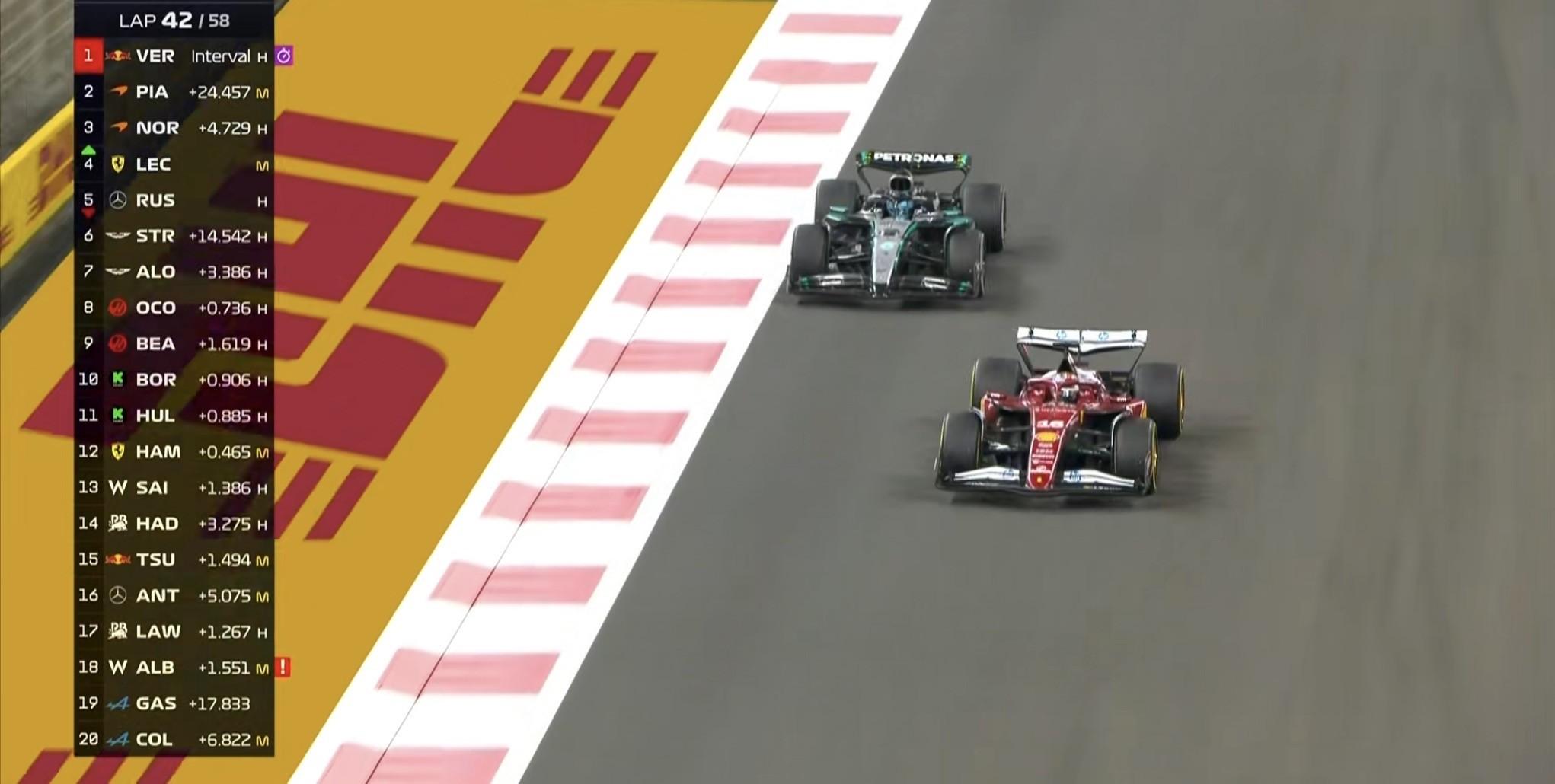 第42圈:勒克萊爾超越拉塞爾上至第4,皮亞斯特里將開始全力壓榨這套中性胎;