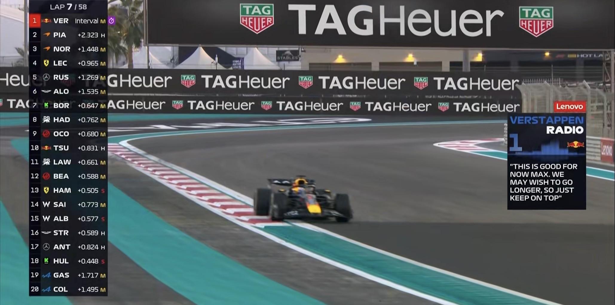 維斯塔潘在6號彎前完成對皮亞斯特里的超越,重新回到領跑位置;