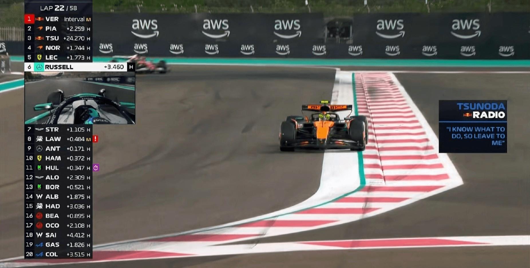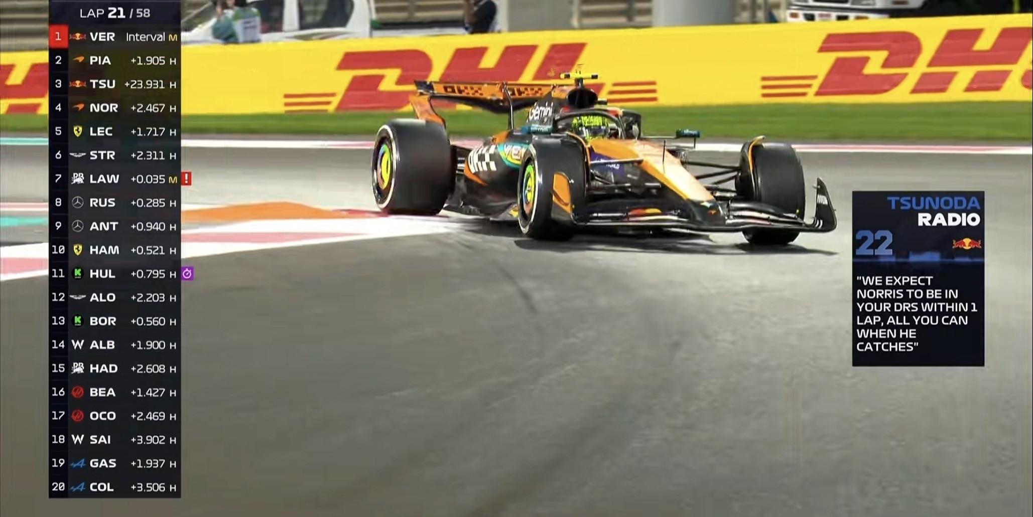 第21圈:車隊告知角田諾里斯將在1圈後進入你的DRS範圍內,他需要盡全力爲維斯塔潘爭取時間!