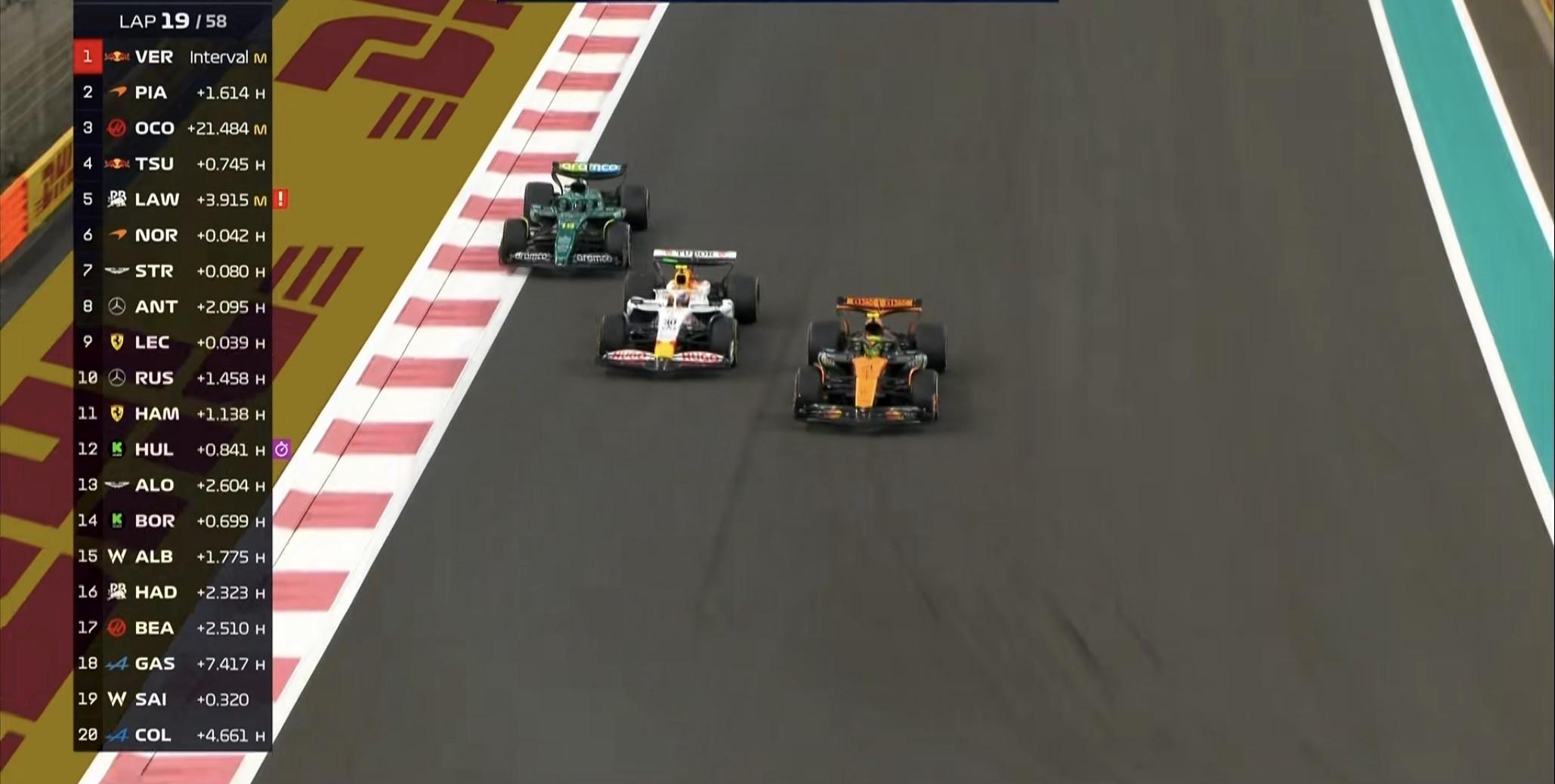 第19圈:諾里斯在6號彎前完成一超二,迅速過掉勞森、斯特羅爾,進入乾淨空氣!