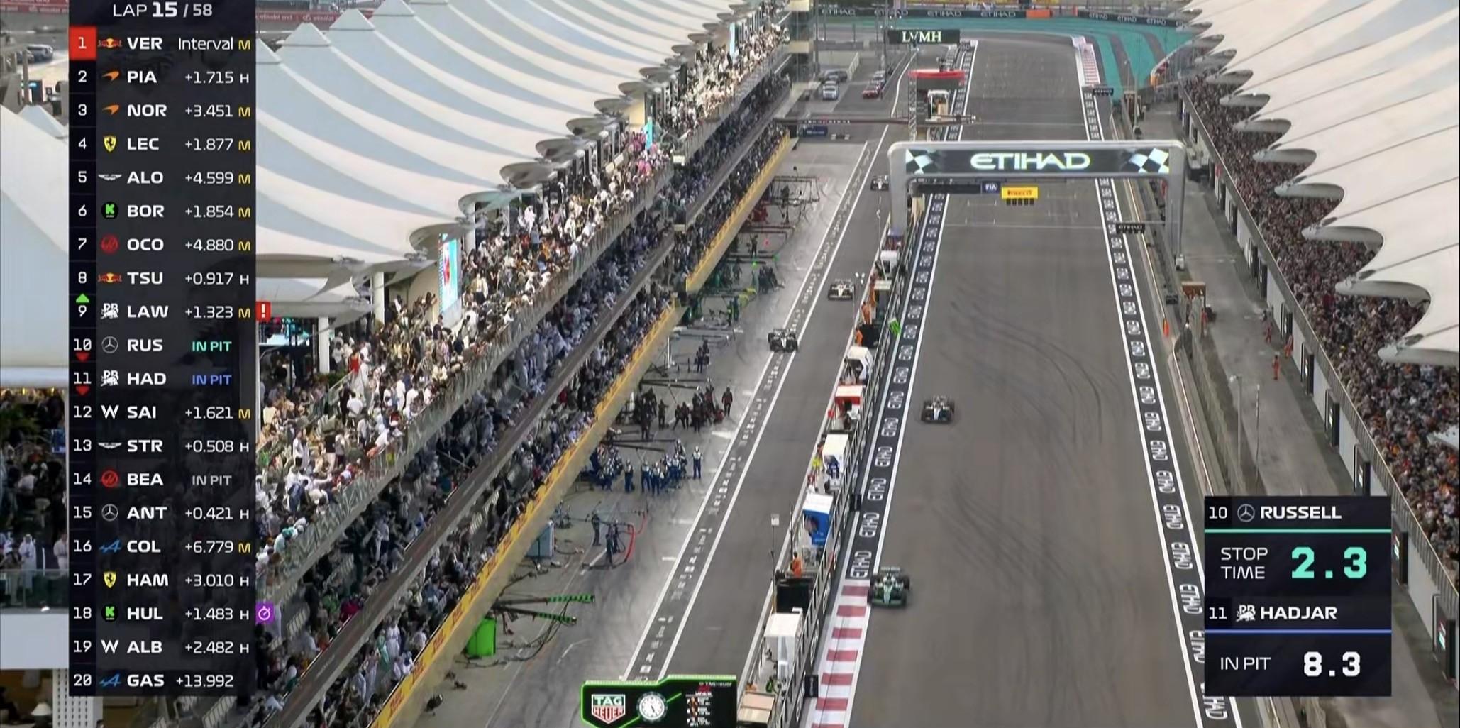 第15圈:拉塞爾、哈賈爾、貝爾曼進站一停,皮亞斯特里逐漸縮進與維斯塔潘的差距;