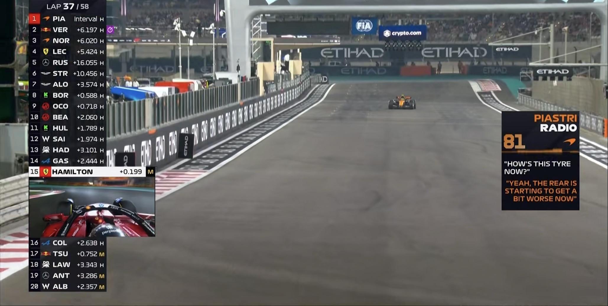 第37圈:皮亞斯特里表示賽車的後輪狀況開始變得糟糕,他仍在等待1停的時間;