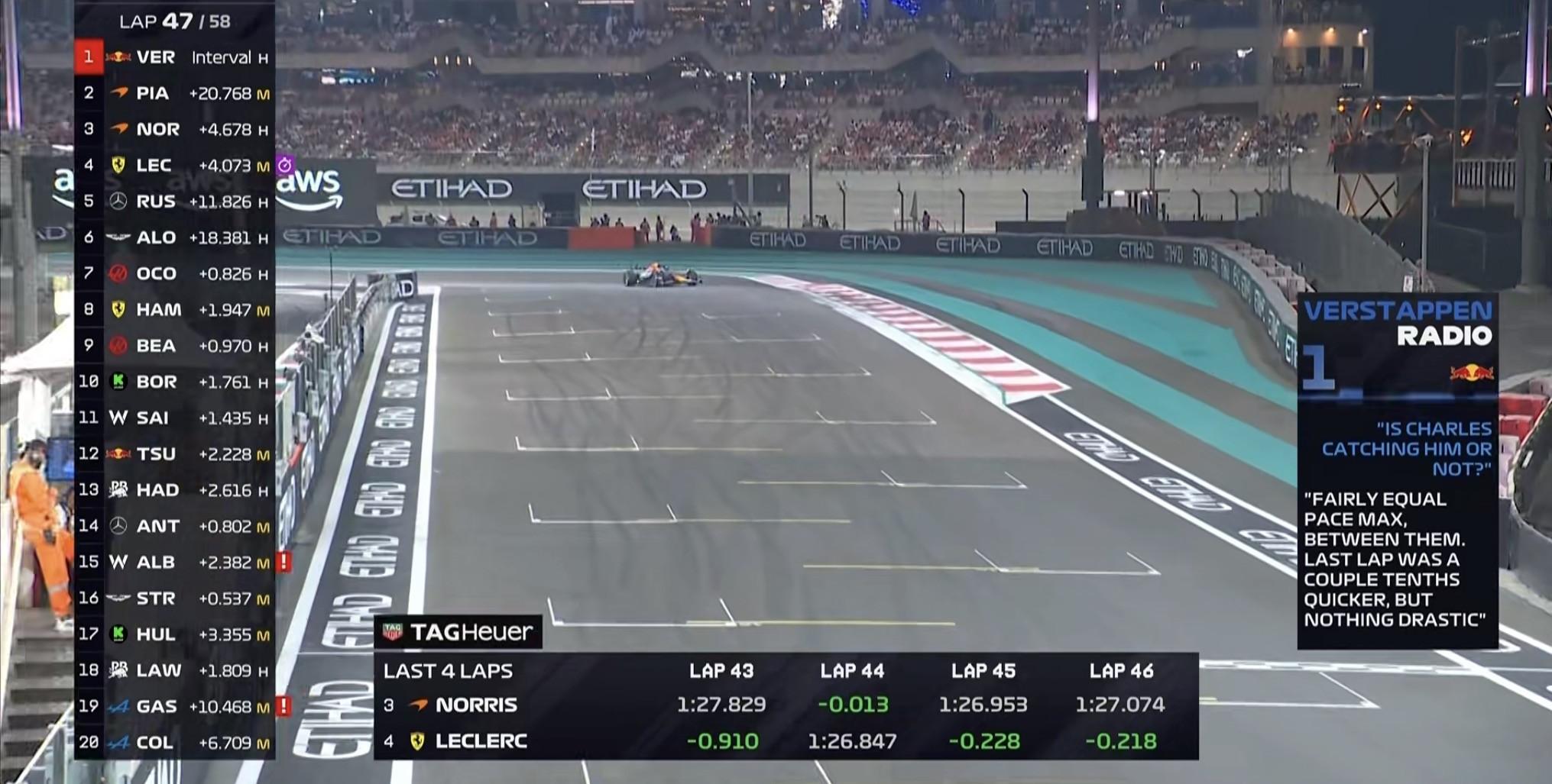 第47圈:維斯塔潘詢問勒克萊爾的情況,GP表示勒克萊爾與諾里斯的圈速基本一致;