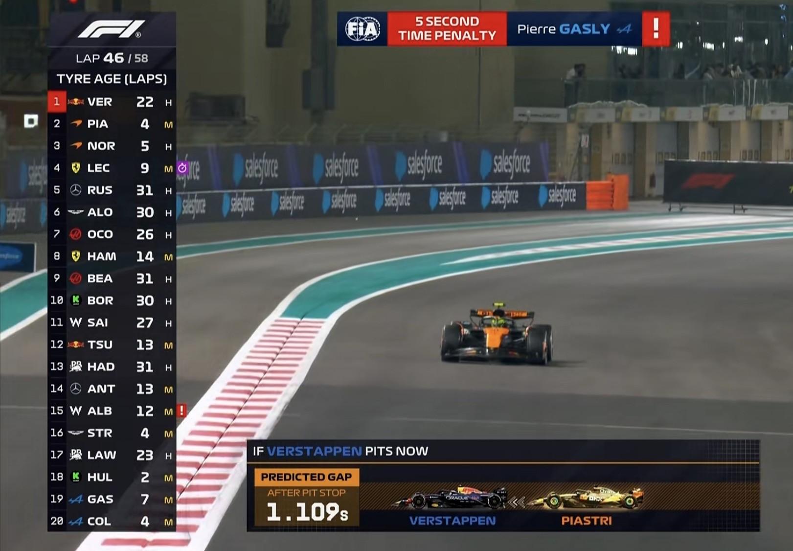 第45圈:加斯利被罰5秒,維斯塔潘在最後一個窗口並未選擇二停;