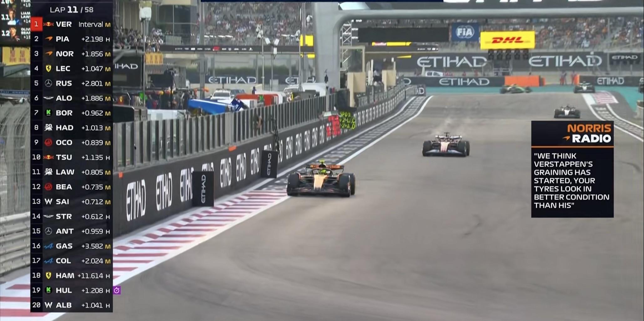 第11圈:車隊告知諾里斯維斯塔潘的輪胎出現顆粒化的狀況,而諾里斯的輪胎狀況會更好;