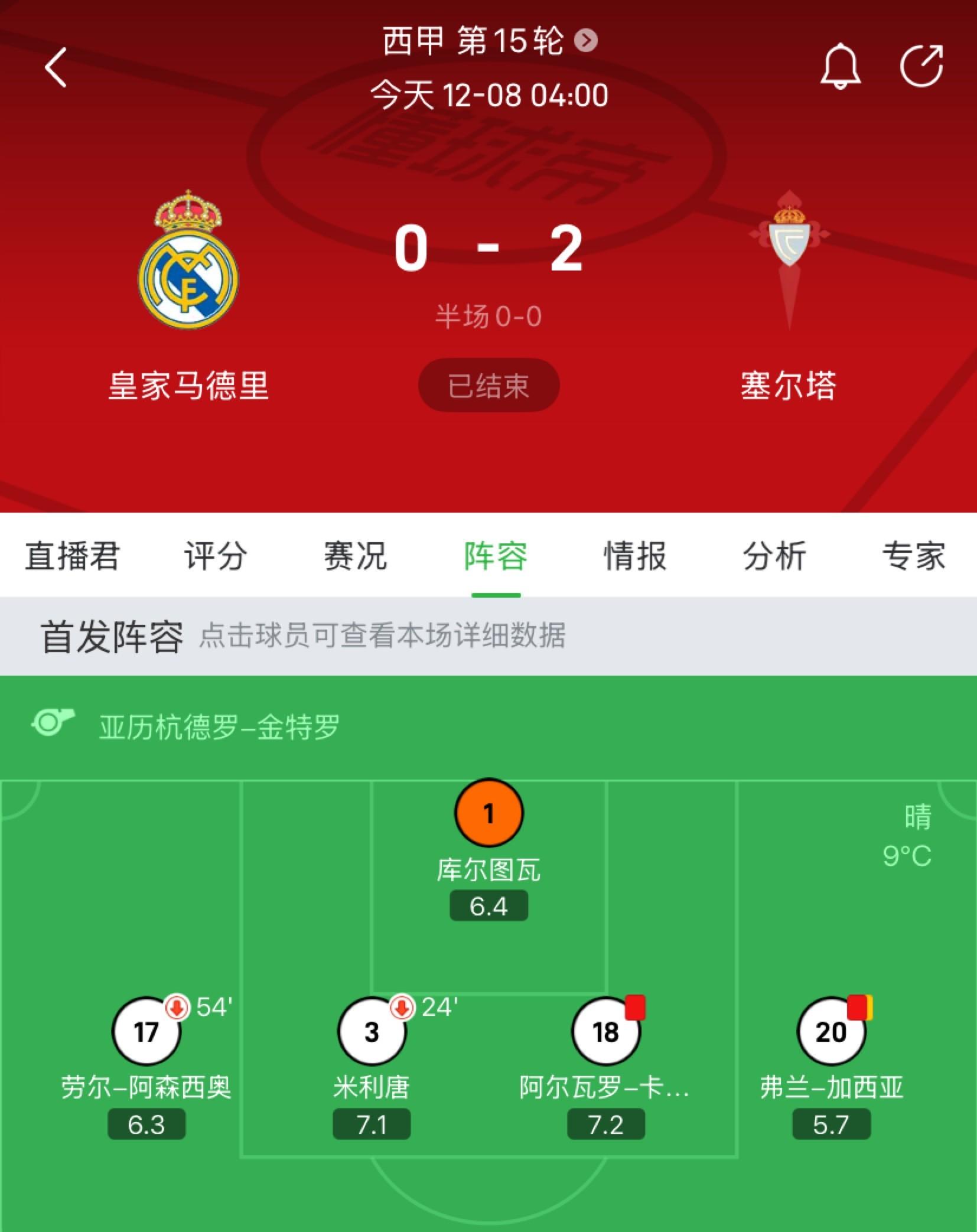 北京時間12月8日,在西甲第15輪的比賽中,皇家馬德里在左後衛弗蘭-加西亞和左中衛阿爾瓦羅-卡雷拉斯先後染紅的情況下,最終主場0-2爆冷不敵塞爾塔,近5輪西甲僅取勝1場。