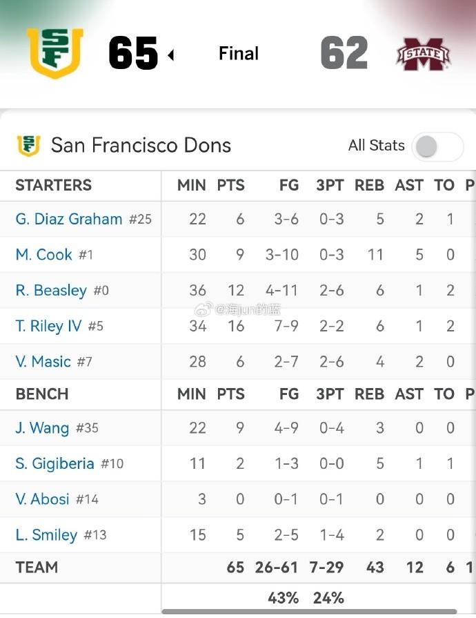 北京時間今日,在NCAA的一場常規賽中,舊金山大學65-62險勝密西西比州立大學。