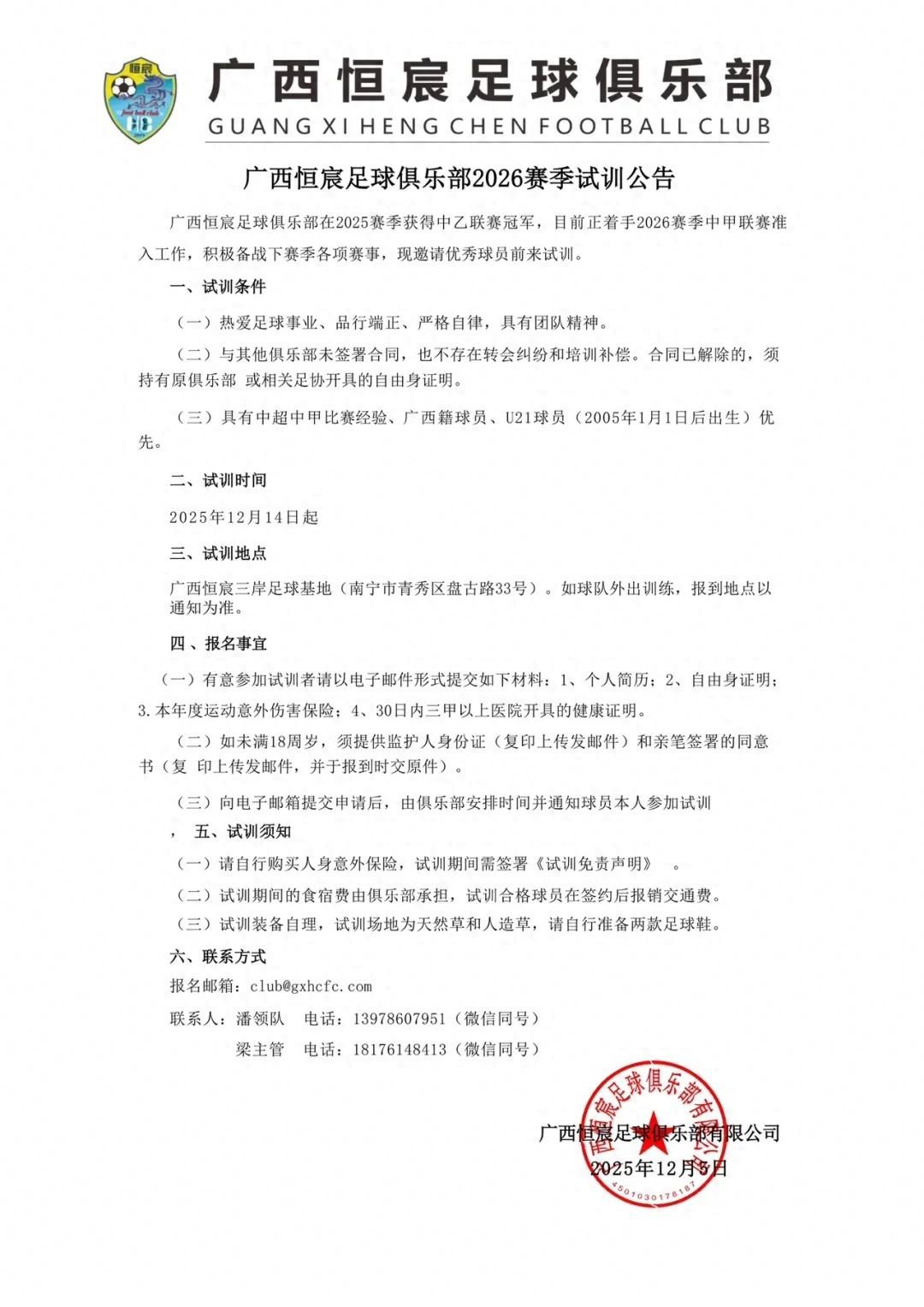 恆宸試訓公告:有中超、中甲比賽經驗、廣西籍、U21球員優先