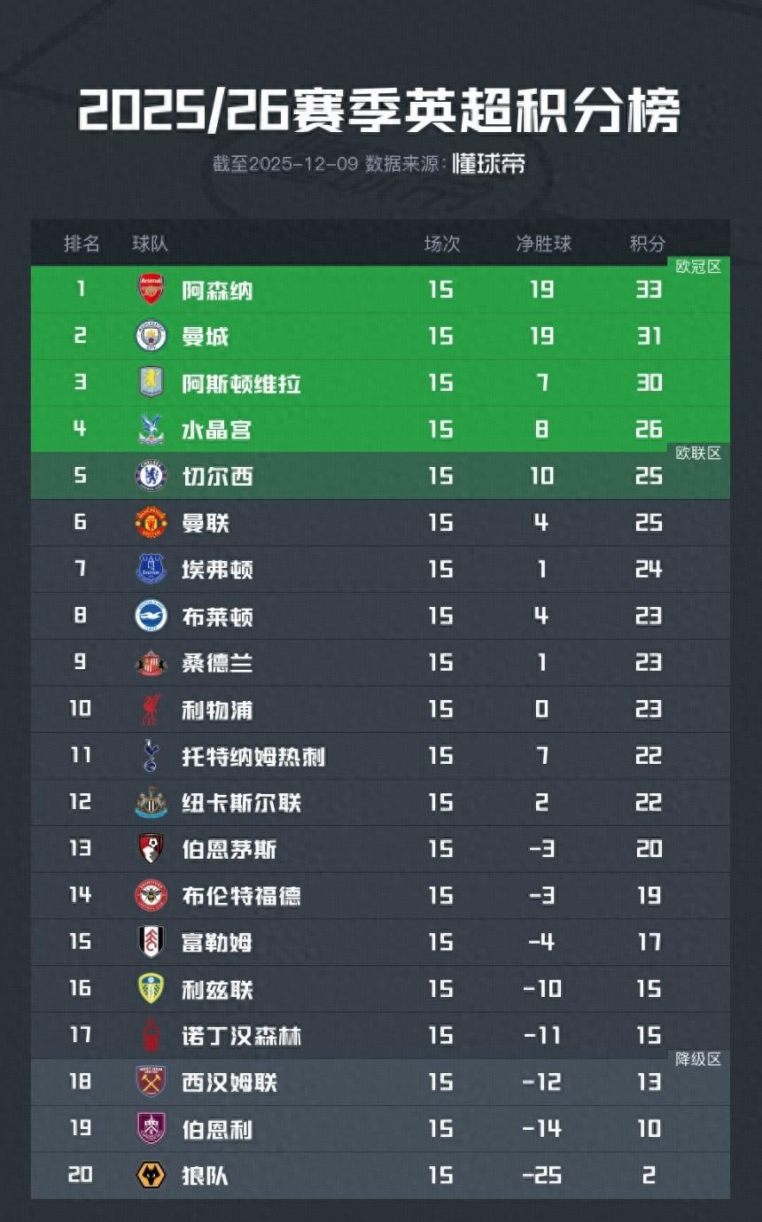 北京時間12月9日,2025/26賽季英超聯賽結束了第15輪的全部較量,積分榜的形勢產生了進一步的變化。