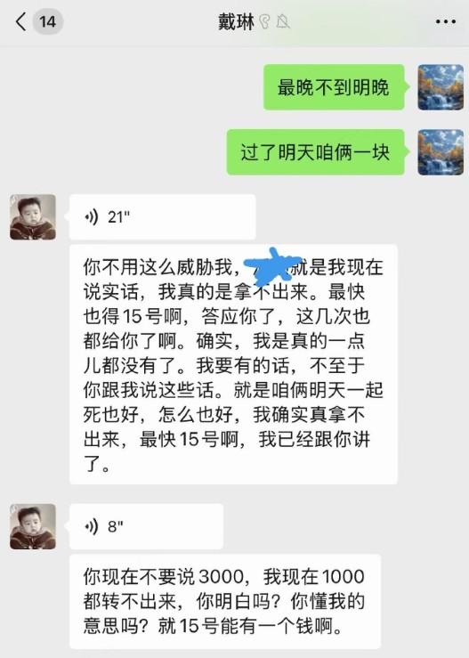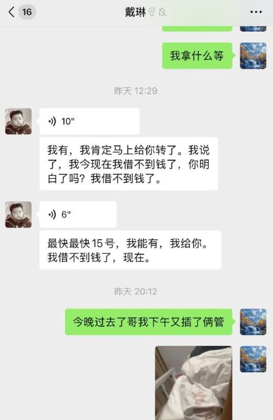 不過,戴琳表示自己目前手頭確實沒有錢,需要到15號才能還錢。