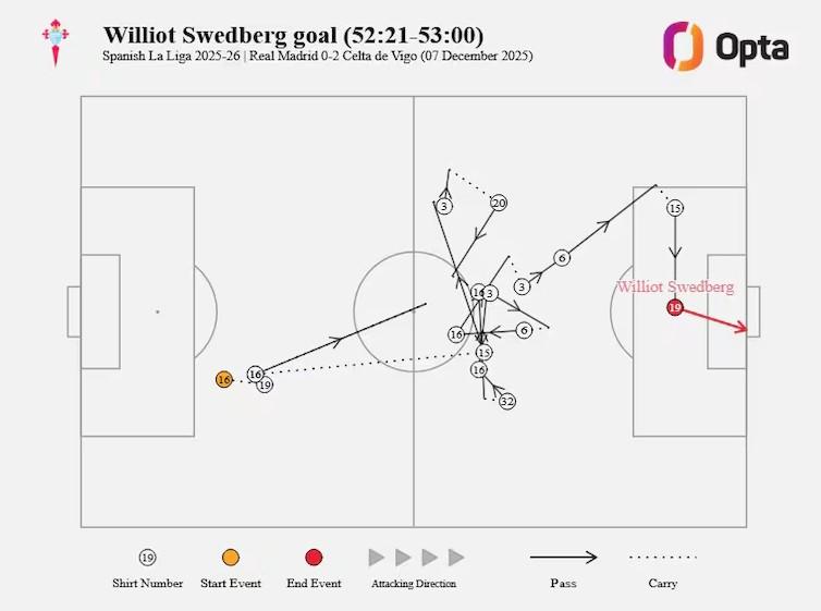 雖然進球者是斯韋德貝里,但塞爾塔幾乎任何球員都有機會完成這粒進球。楚阿梅尼放任明格薩進入禁區,反應遲緩,體現了球隊在盯人上的疏忽。弗蘭-加西亞的表現幾乎更糟。