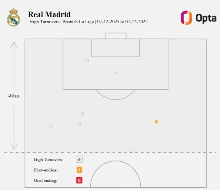 爲了佐證這種觀點,統計數據也隨之而來。皇家馬德里在進攻區域僅完成了6次搶斷,比他們在西甲聯賽中的平均水平少了近4次,而他們的PPDA值(因防守動作而讓對手獲得的傳球次數)高達14次,比平均水平高出3.5。
