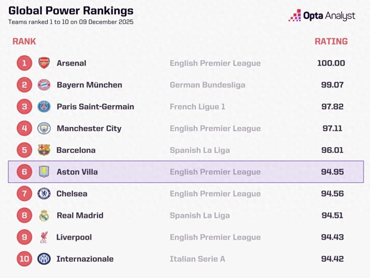 北京時間12月9日,知名數據機構Opta列出了全球範圍內目前實力排名前10的俱樂部,阿森納、拜仁慕尼黑以及巴黎聖日耳曼位列前三,上週末絕殺槍手的阿斯頓維拉位居第6。