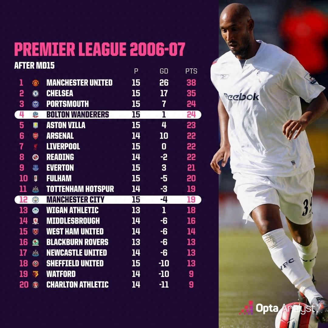 根據Opta的統計,英超上一次在前15輪過後排名第4和排名第12的球隊之間分差不超過5分發生在2006-07賽季,當時博爾頓以24分排名第4,隨後是維拉(23分)、阿森納(22分)、利物浦(22分)、雷丁(22分)、埃弗頓(21分)、富勒姆(20分)、熱刺(19分)以及曼城(19分)。