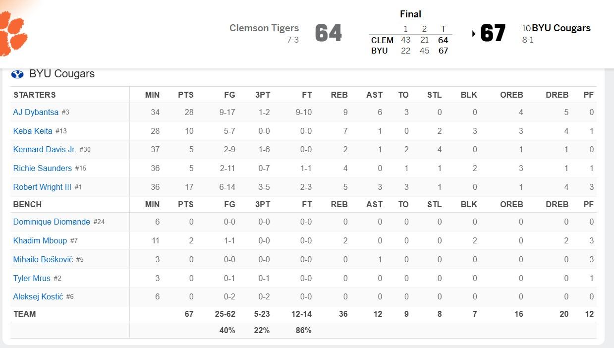 北京時間今日,在NCAA常規賽中,楊百翰大學以67-64完成22分大逆轉,擊敗了克萊門森大學。
