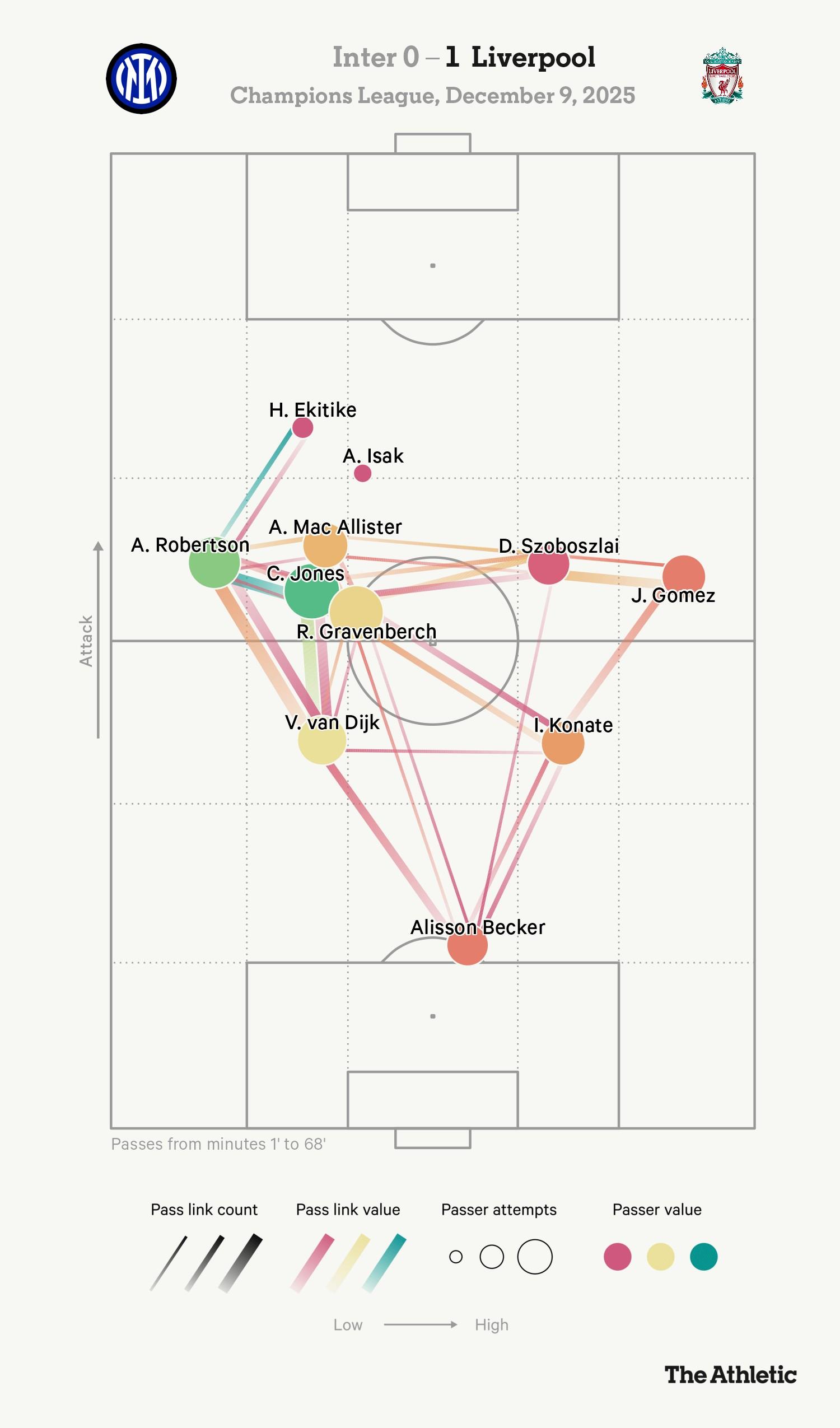 斯洛特棄用薩拉赫的決定導致了“安全第一”的戰術思路,這影響了球隊的進攻威脅。這也限制了兩名中鋒可能產生的影響力,他們之間幾乎沒有什麼聯繫(如下方的傳球矩陣圖所示),但在歐洲賽場一場艱難的客場之旅中,這從來都不是易事。