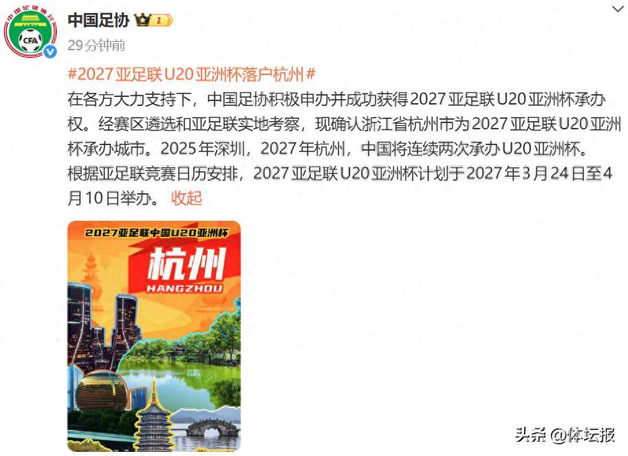 中國足協發文:在各方大力支持下,中國足協積極申辦併成功獲得2027亞足聯U20亞洲盃承辦權。經賽區遴選和亞足聯實地考察,現確認浙江省杭州市爲2027亞足聯U20亞洲盃承辦城市。2025年深圳,2027年杭州,中國將連續兩次承辦U20亞洲盃。根據亞足聯競賽日曆安排,2027亞足聯U20亞洲盃計劃於2027年3月24日至4月10日舉辦。