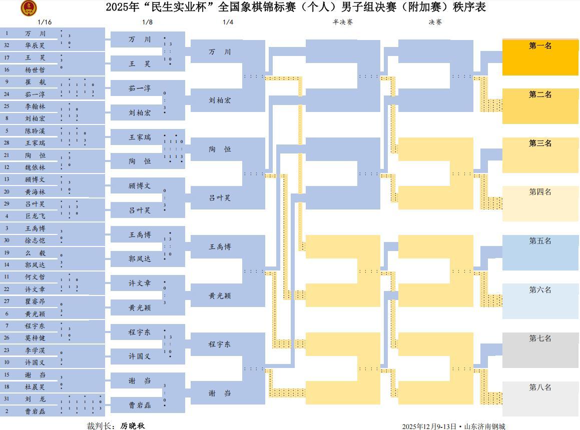 男子組中,上半區,第一1/8區,05年的黑馬萬川與象甲猛將王昊慢棋打平後,在加賽快棋中,萬川執後手多卒破紅仕相108手勝出,進入到八強。