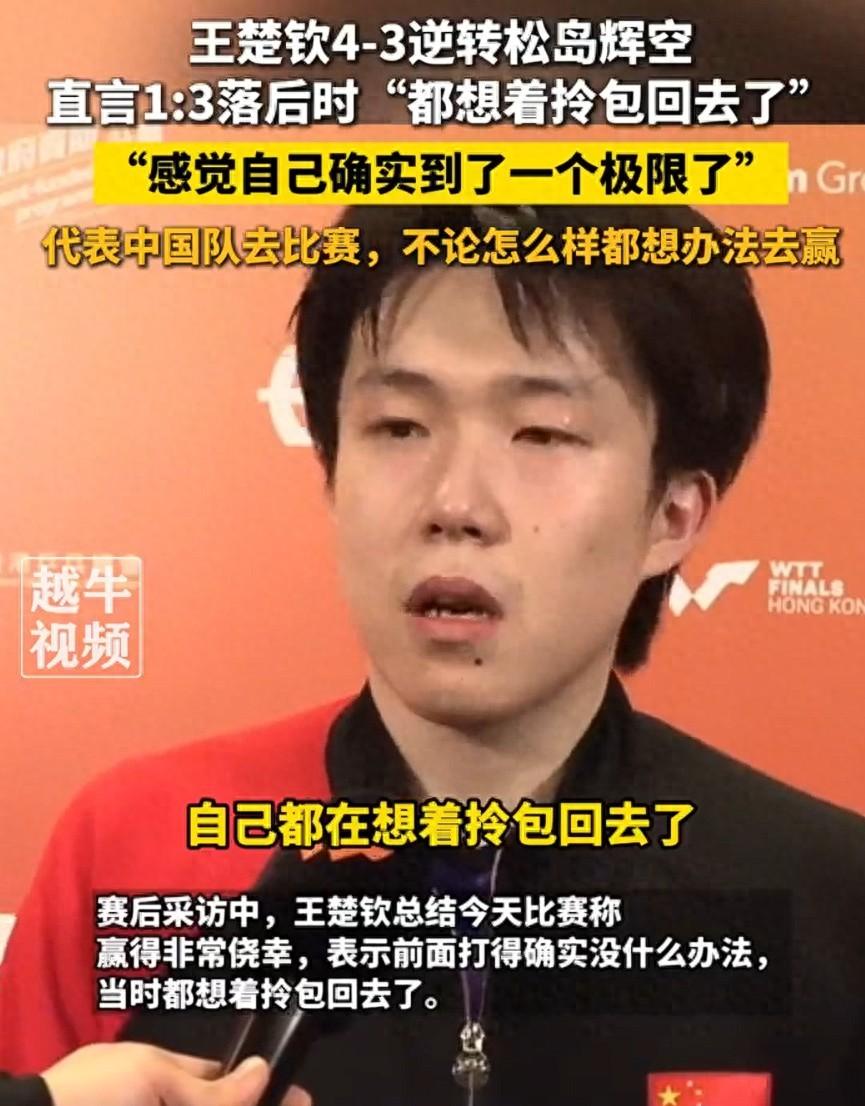 12月10日,。賽後,王楚欽說道:1-3落後時我都想着拎包回去了,確實到了極限。
