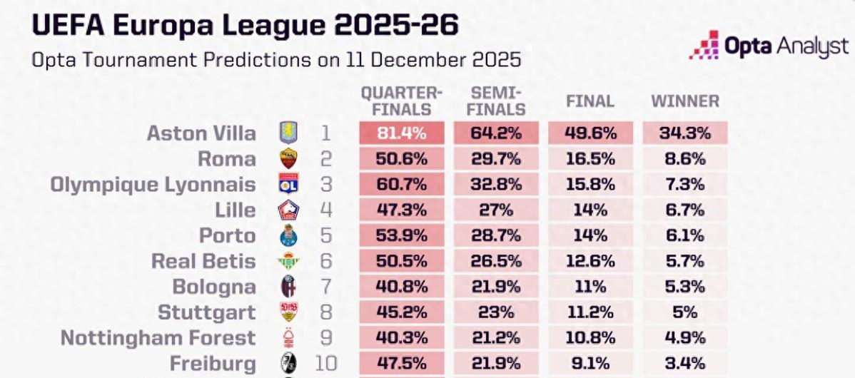 北京時間12月11日,知名數據機構Opta的超級電腦預測了本賽季歐聯杯參賽球隊的成績,阿斯頓維拉以34.3%的奪冠概率高居第一,羅馬8.6%位列第二,里昂7.3%排名第三。
