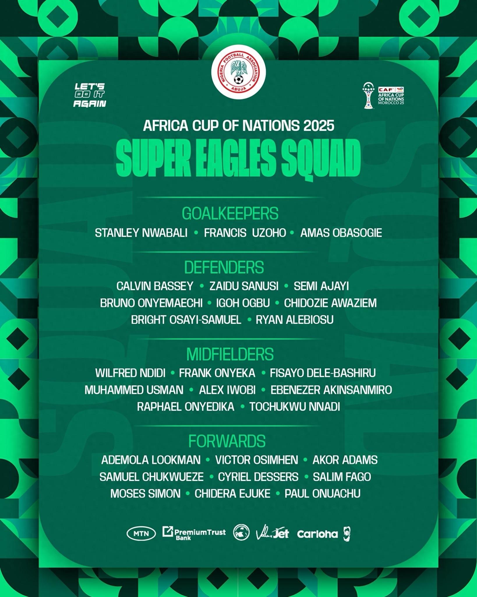 北京時間12月12日,尼日利亞國家隊公佈了他們2025年非洲杯的參賽大名單,奧斯梅恩領銜,盧克曼、丘庫埃澤、伊沃比、巴錫在列。