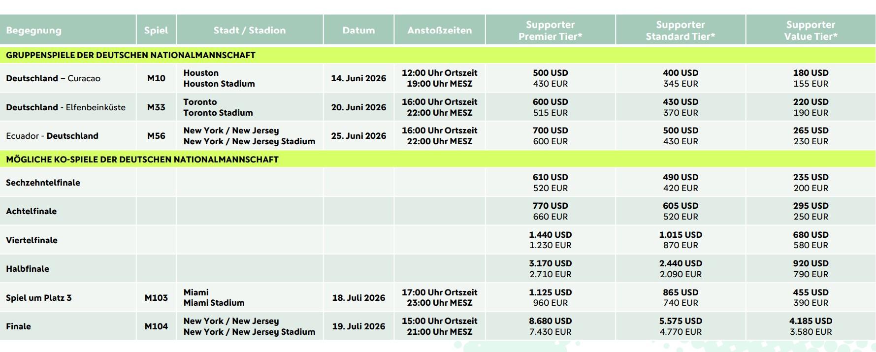 在德國足協公佈的一份購票指南當中,小組賽其球迷看臺最低票價爲180美元,爲首戰對陣庫拉索的比賽。如果德國進入決賽,目前最低票價爲4185美元。