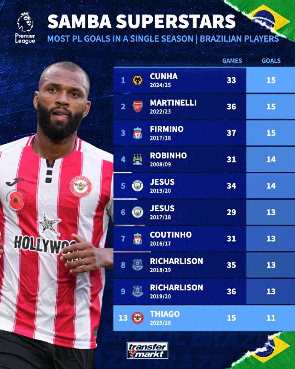 北京時間12月13日,德轉列出了巴西球員英超單賽季進球數TOP10,馬特烏斯-庫尼亞、馬丁內利以及菲爾米諾15球並列第一,本賽季英超前15輪就打進11球的伊戈爾-蒂亞戈位列第13位。