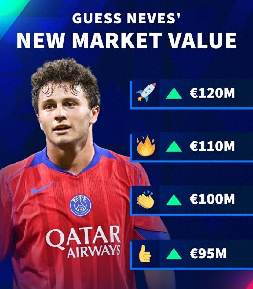 德轉將在12月15日更新法甲球員的身價,此次他們給出的若昂-內維斯三個身價更新的選項分別爲上漲至1.2億歐元、上漲至1.1億歐元、上漲至1億歐元以及上漲至9500萬歐元。