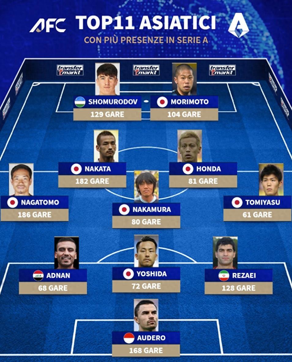 德轉列意甲出場數最多的亞洲球員11人陣容: