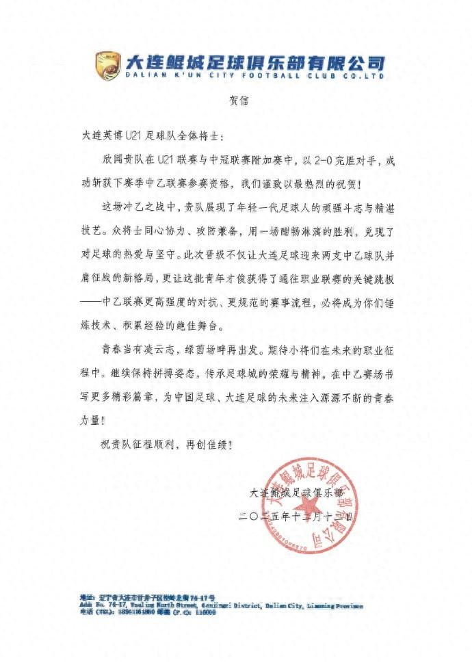 中冠/U21聯賽升級附加賽,大連英博U21隊2-0戰勝同城對手大連涵瑀,獲得下賽季中乙准入資格。今日,大連鯤城送上賀信。