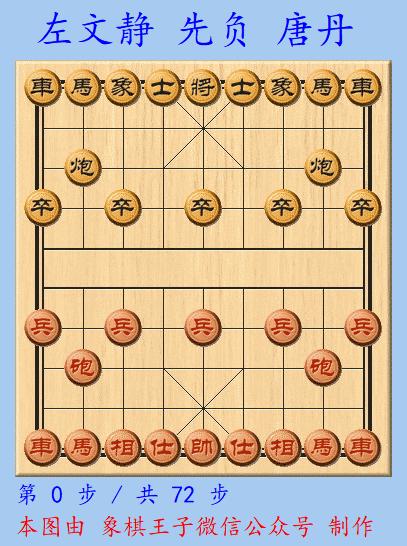 加賽快棋,左文靜執先手使出自己的飛相拿手陣勢,唐丹應以右士角炮,佈局紅方左車橫起,然後拉至六路,升於高位,意欲控盤。
