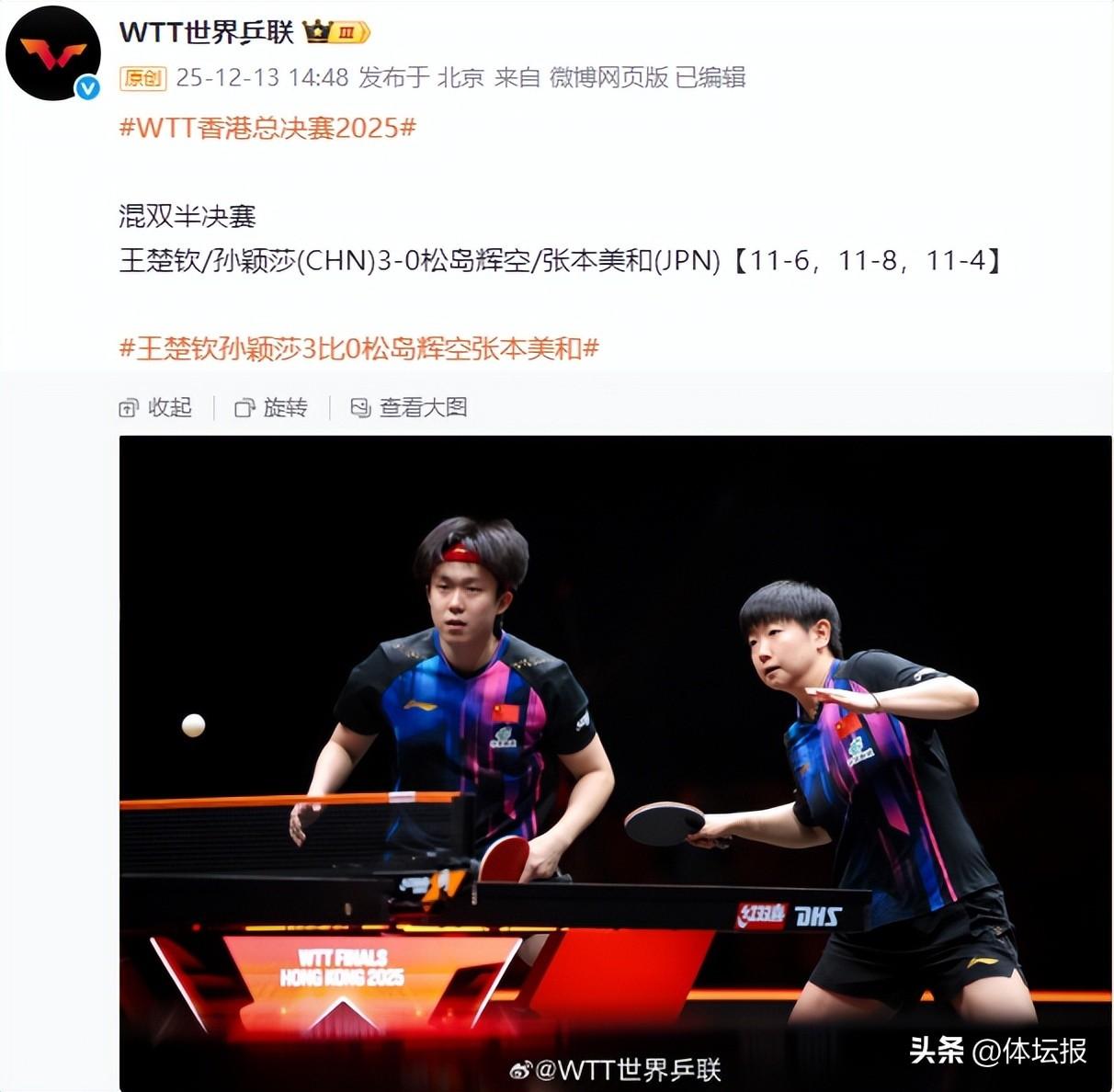 12月13日,“莎頭”組合在WTT香港總決賽混雙半決賽中(圖自@WTT世界乒聯)