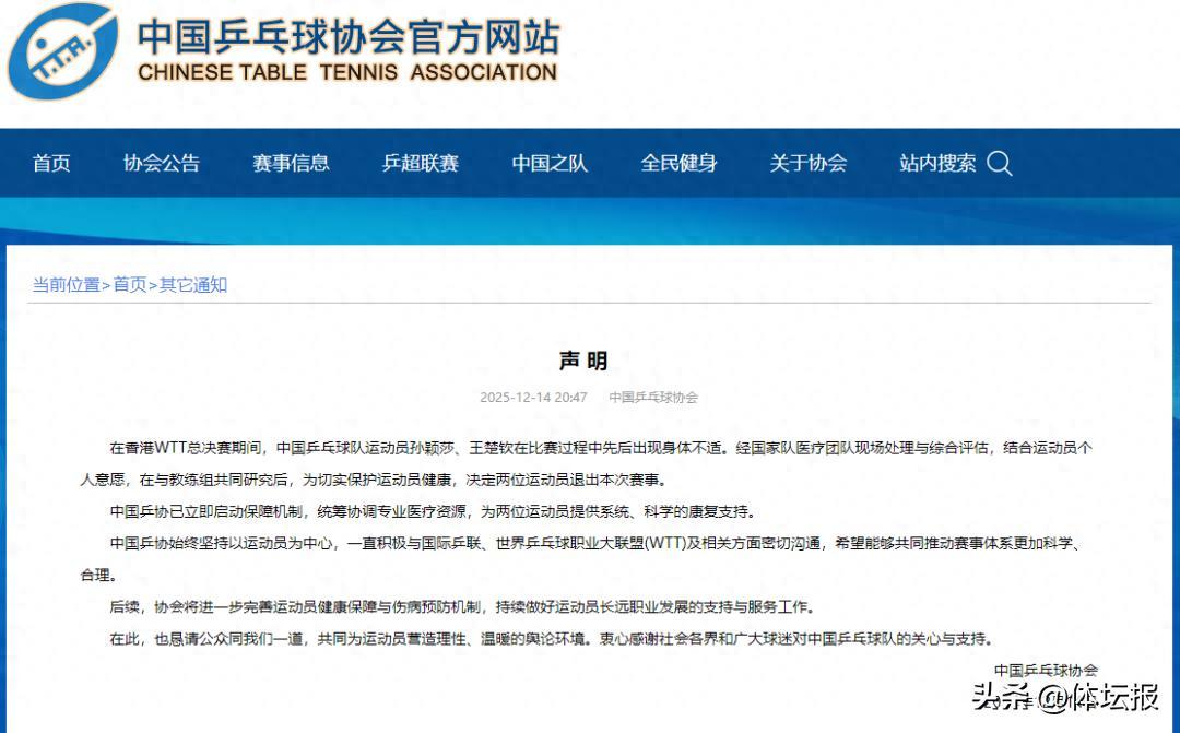 12月14日晚,中國乒乓球協會在官網發佈聲明,對國乒隊員孫穎莎、王楚欽在世界乒乓球職業大聯盟(WTT)香港總決賽期間因身體不適退賽作出回應,表示將進一步完善運動員健康保障與傷病預防機制,持續做好運動員長遠職業發展的支持與服務工作。