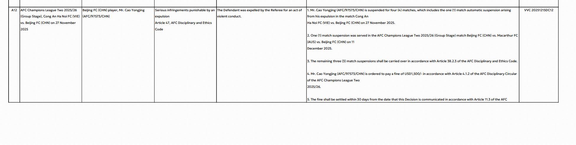 2. 其中一場禁賽在2025/26賽季亞足聯冠軍聯賽第二階段(小組賽)北京國安對陣麥克阿瑟FC的比賽中執行。