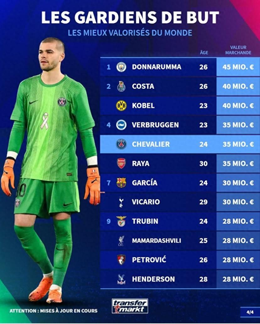 北京時間12月15日,在更新了法甲球員的身價之後,德轉列出了目前世界足壇身價排名前10的門將,多納魯馬4500萬歐元第一,此次更新後身價下跌500萬歐元的舍瓦利耶以3500萬歐元並列第四。