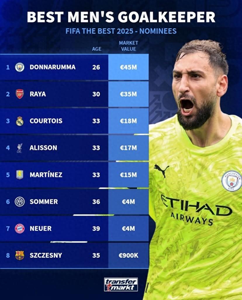 北京時間12月16日,德轉統計出了2025年FIFA年度最佳門將提名者的身價排行榜,多納魯馬4500萬歐元排名第一,身價最低的什琴斯尼僅爲90萬歐元。