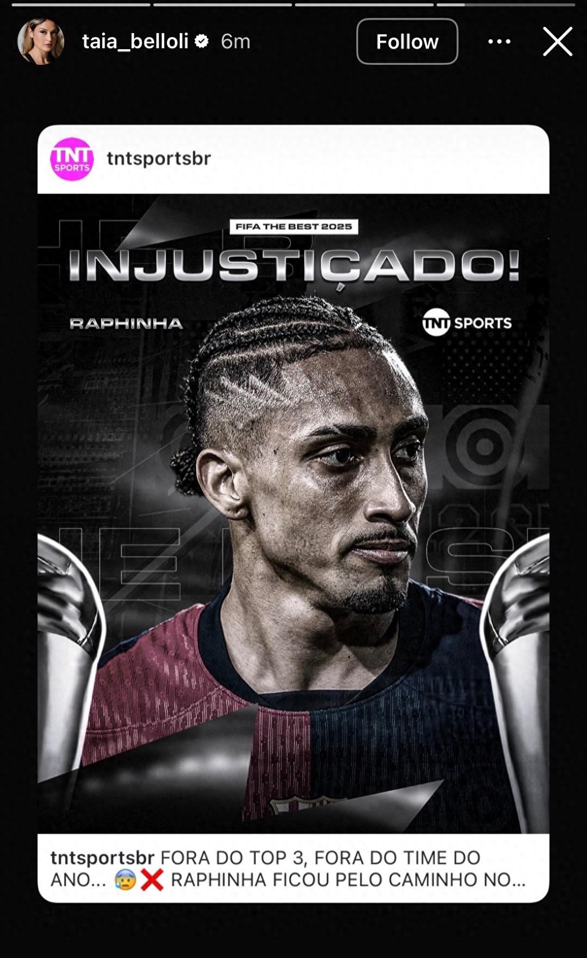 國際足聯在2025年度最佳頒獎典禮上公佈了年度最佳陣容,但巴塞羅那前鋒拉菲尼亞未能入選引發了他的妻子的不滿。