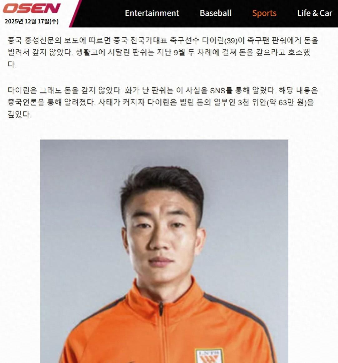 該韓媒以《中國足球真的那麼糟糕嗎?一前國腳向球迷借錢,甚至對其進行辱罵》爲題,報道了戴琳欠錢一事。