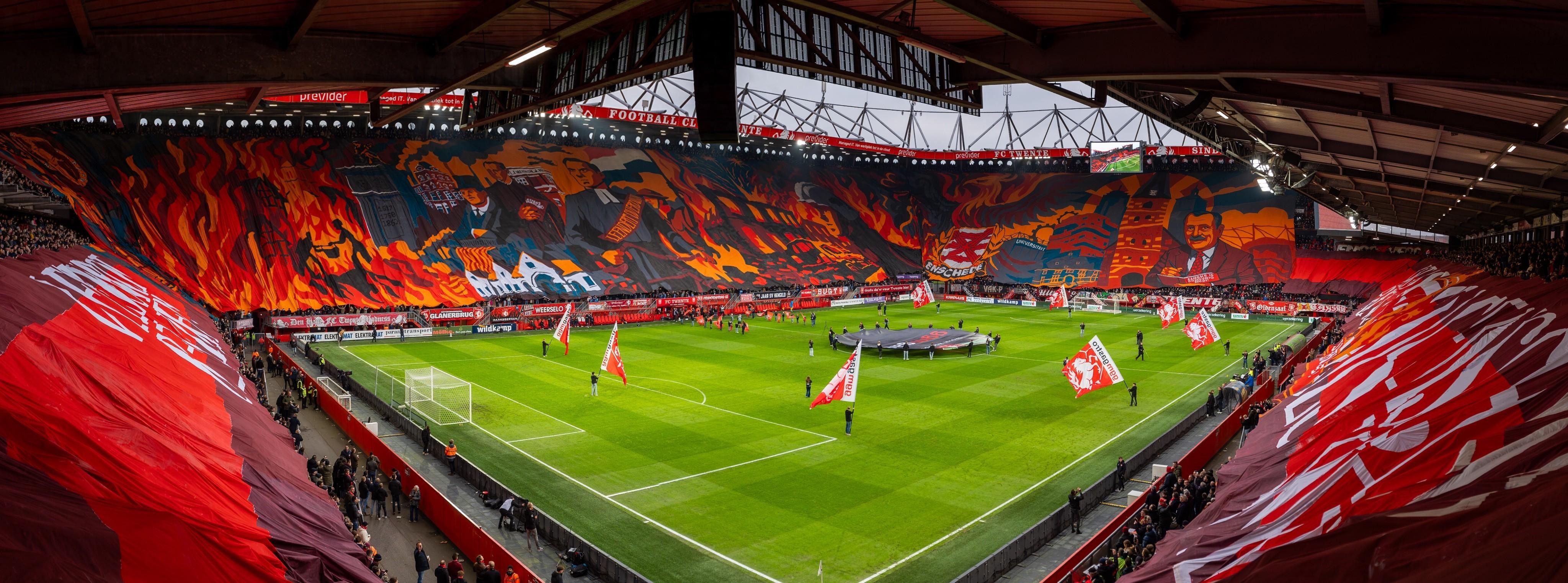 就在上週末的荷甲賽場上,特溫特球迷帶來了一幅震撼世界的巨型Tifo。它橫跨四面看臺,總面積達18000平方米,使用了2550升塗料,創造了歐洲足球史上的紀錄。也許你對這個面積沒有概念,一塊標準足球場的面積是105*68=7140平方米,這幅Tifo的規模超越了兩個半球場之和。