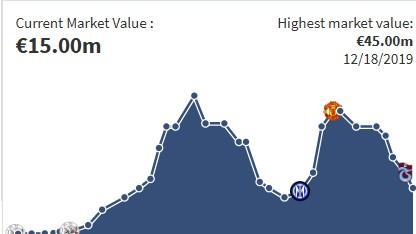 奧納納的身價巔峯出現在2019年12月18日,當時他效力於阿賈克斯,身價來到了4500萬歐。從國米加盟曼聯後,他的身價又迎來了第二次高峯,達到了4000萬歐元,不過自那以後,奧納納的身價就一路下滑,目前已經來到了1500萬歐。