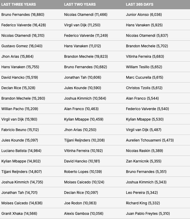 報告顯示,皇家馬德里和烏拉圭中場巴爾韋德以16428分鐘排名第二,儘管在這段時間內他的出場場次比費爾南德斯多出7場。效力於本菲卡的阿根廷老將奧塔門迪位列第三,這位37歲的後衛在187場比賽中累計出場16310分鐘。奧塔門迪曾在2015年至2020年期間效力於曼城。排名第四和第五的分別是帕爾梅拉斯後衛古斯塔沃-戈麥斯和狼隊中場阿里亞斯,過去三年的出場時間分別爲16040分鐘和15864分鐘。阿里亞斯於夏天從弗魯米嫩塞加盟狼隊。