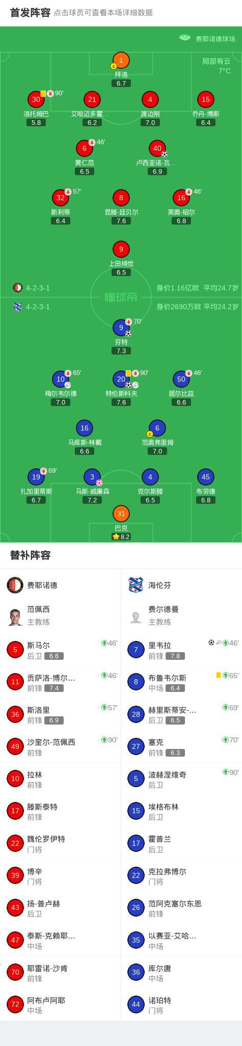 海倫芬3-2費耶諾德,特倫斯科夫1射1傳,裏韋拉替補傳射